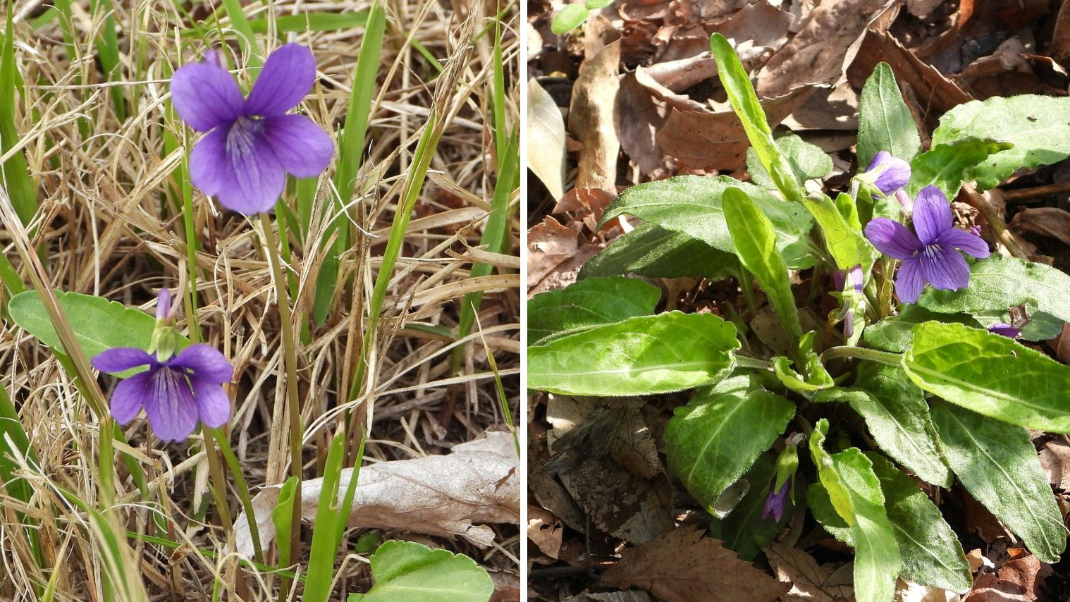 ⬇️ 紫色のスミレ 左はスミレ(ホンスミレ)かな。右はノジスミレ。