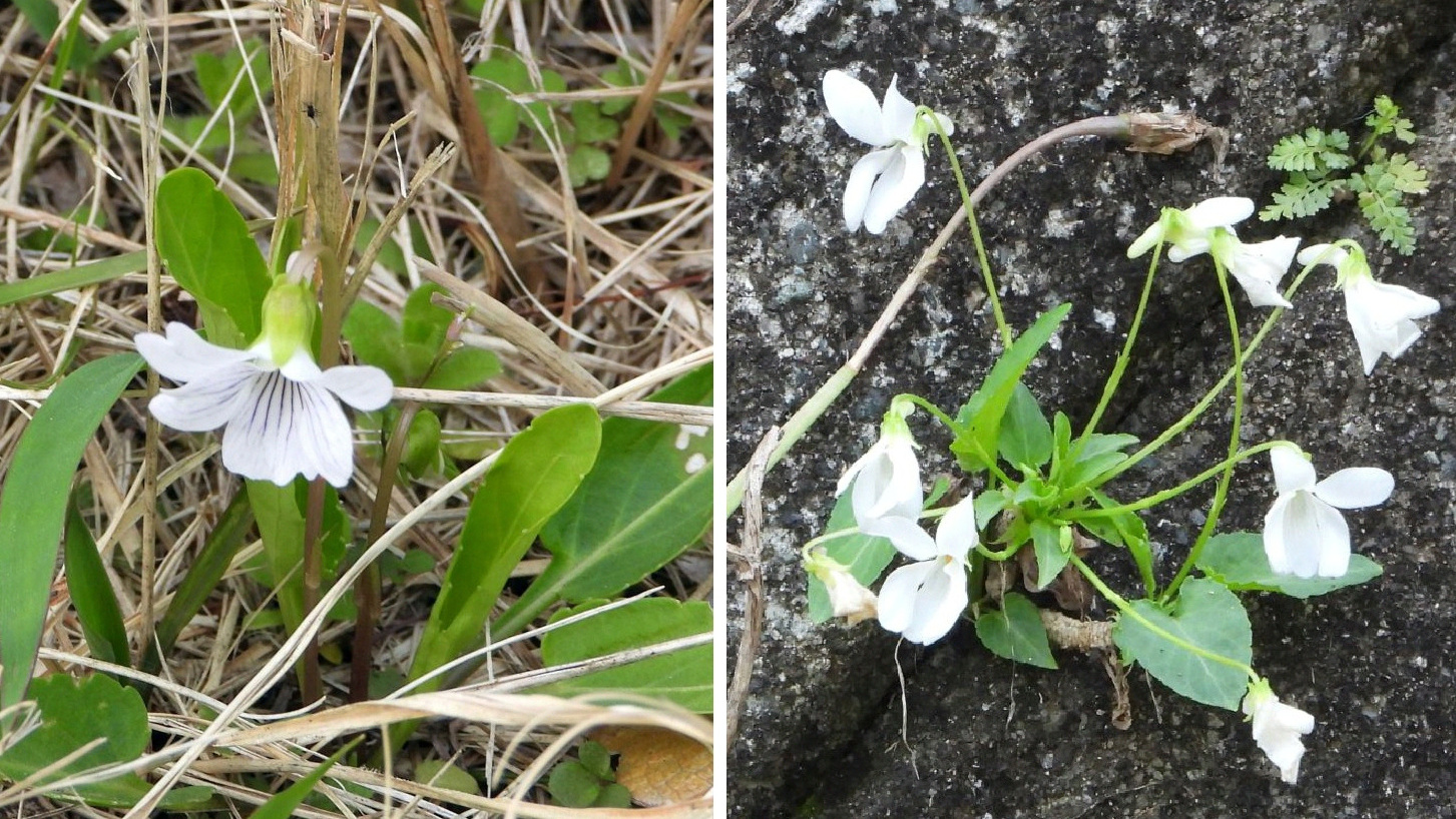 ⬇️ 白い色のスミレ 左はアリアケスミレかな。 右はシロバナコスミレかな。