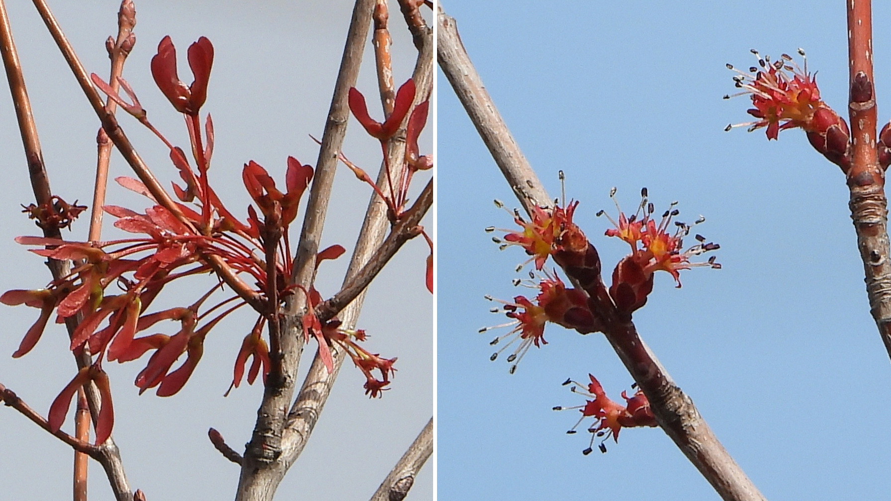 ⬇️ ハナノキ(別名ハナカエデ) 雌雄異株の日本の固有種。左が雌木で右が雄木。環状4号の街路樹。