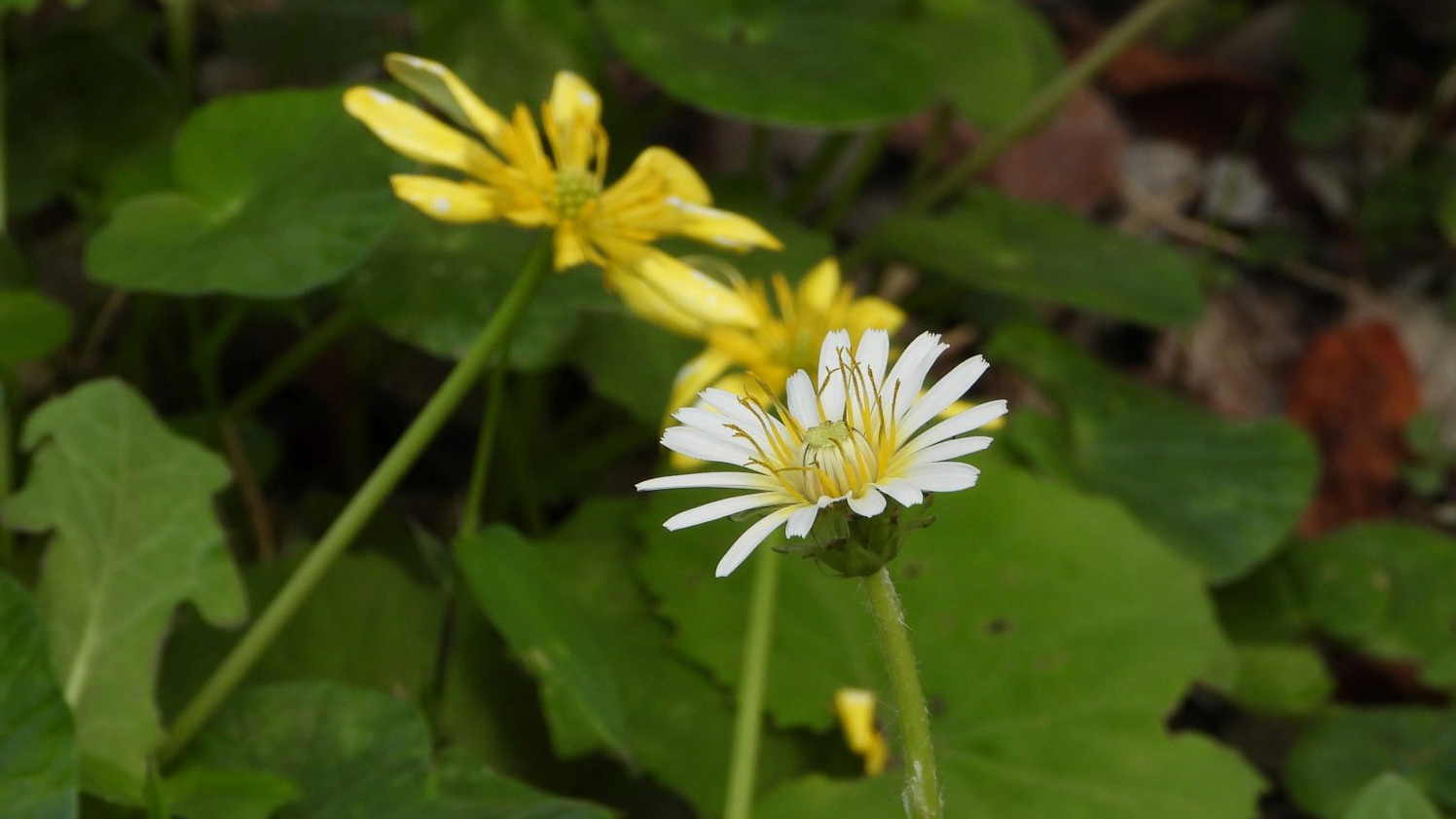 ⬇️ シロバナタンポポ 「子どもの森」でも咲いた。後ろの黄色い花はヒメリュウキンカ。