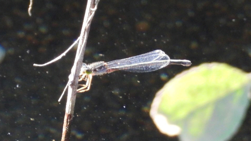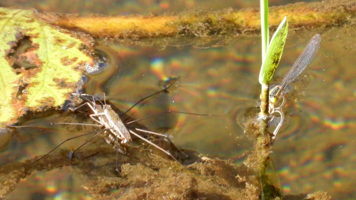 ⬇️ アオモンイトトンボ きょう見たのはメスだけだった。   ↓ イトトンボは産卵中。アメンボのメスの背中にオスが乗っている。