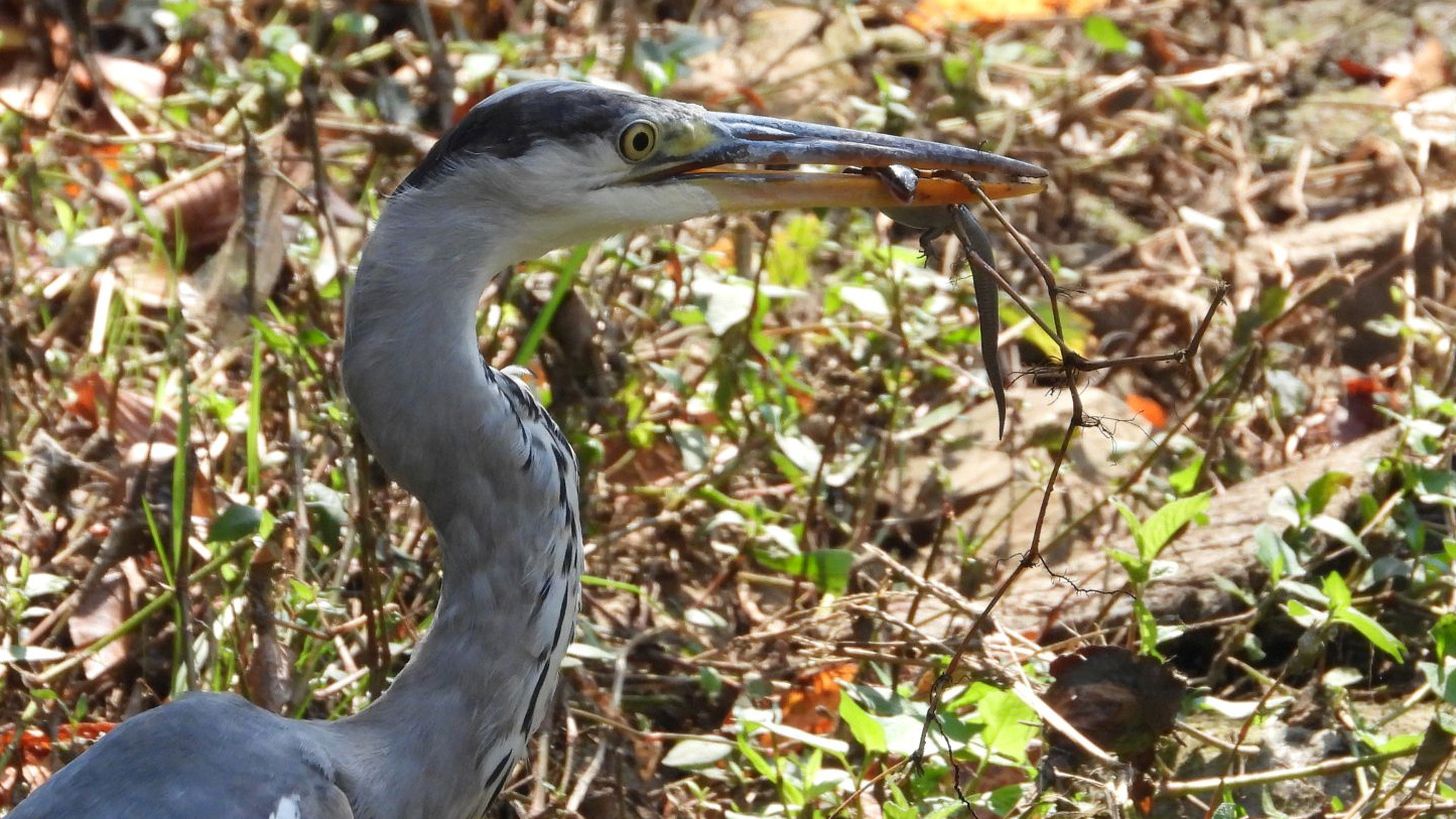 ⬇️ アオサギ トカゲと枯れ草をゲット。草だけを落とそうとしていたがトカゲも逃がしてしまった。