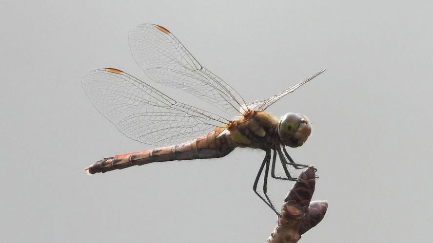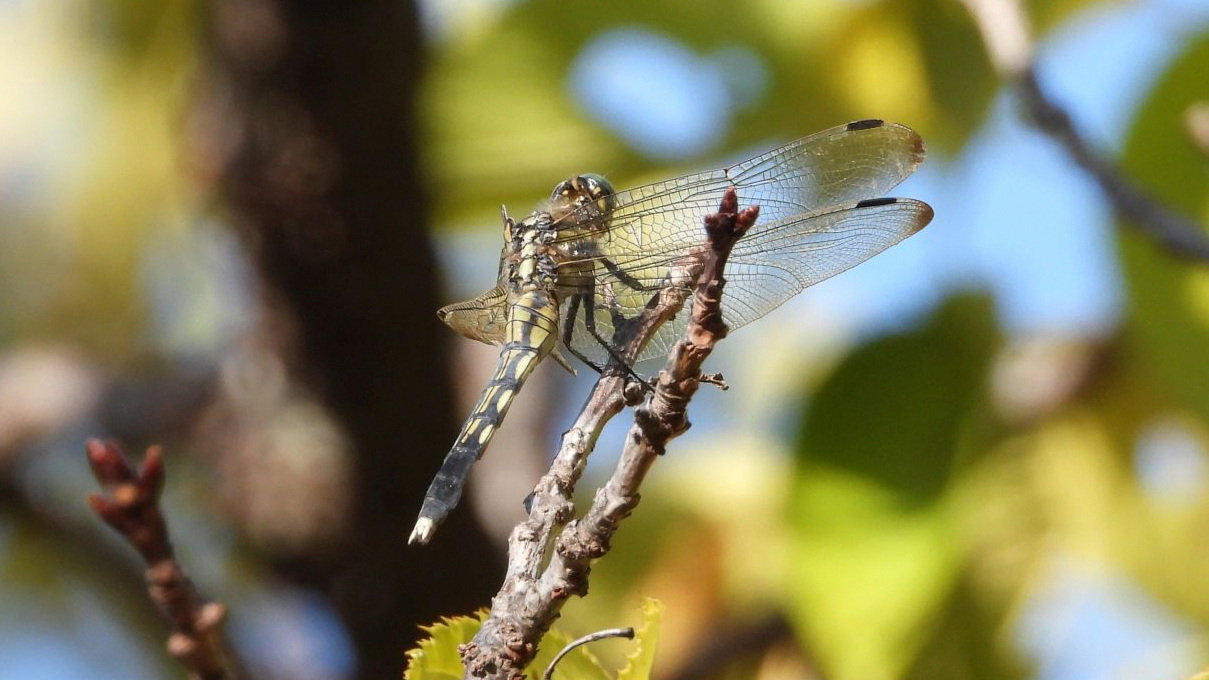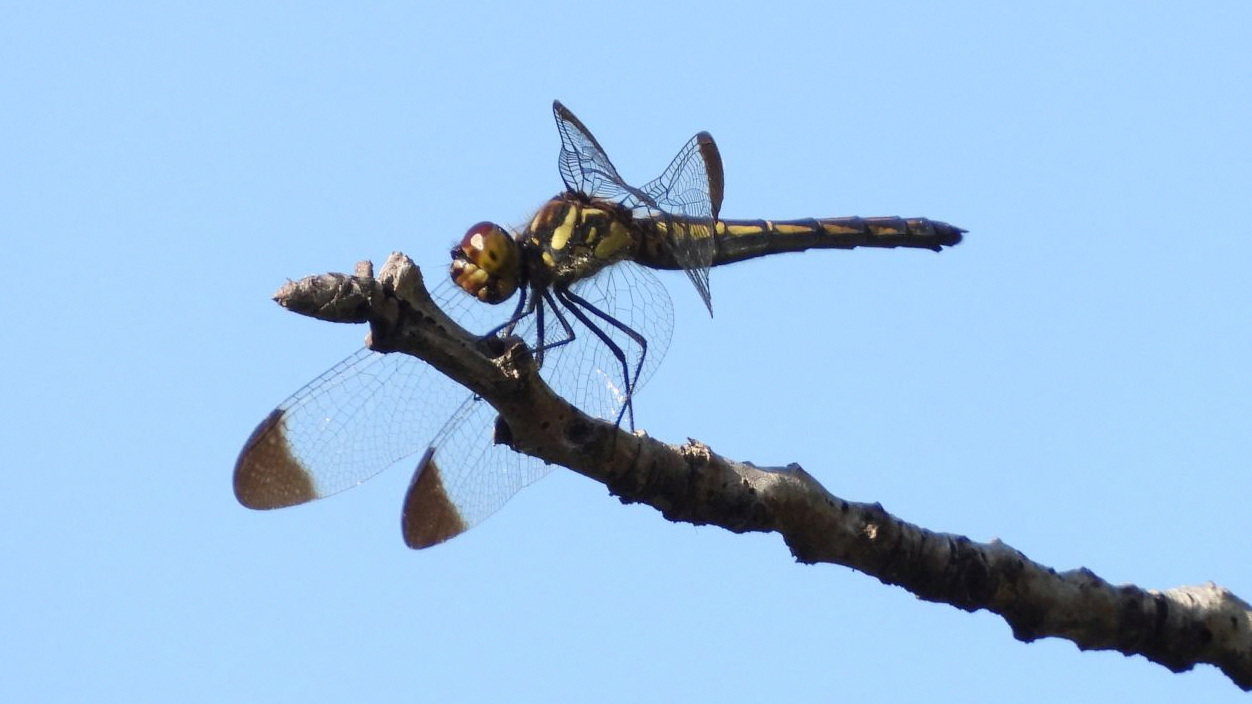 ⬇️ コノシメトンボ(オス) 桜の木のてっぺんに止まっていても、翅先の茶色でそれと分かる。