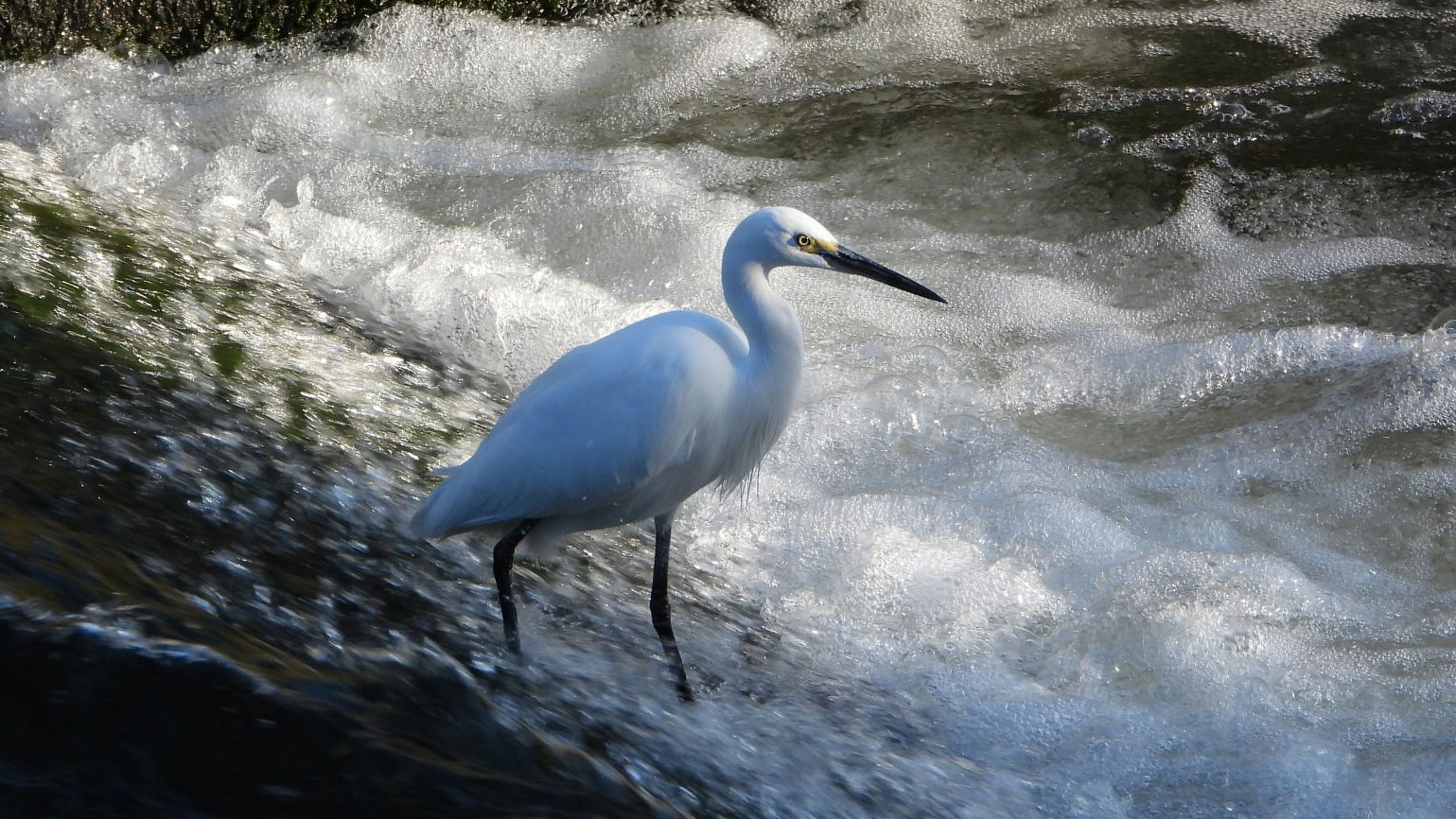 ⬇️ コサギ 2mほどの段差の中程で、脚を踏ん張って遡上する魚を待っていた。