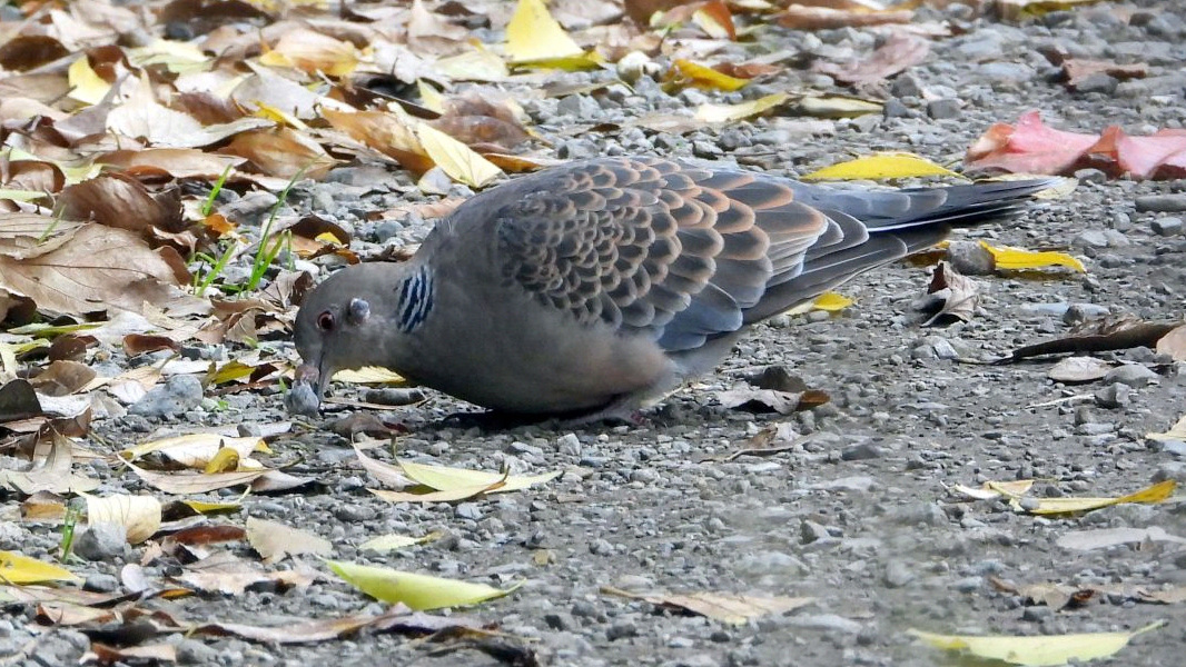 ⬇️ キジバト   ムクの実を咥えている。顔や嘴にできもの? 病気だろうか。