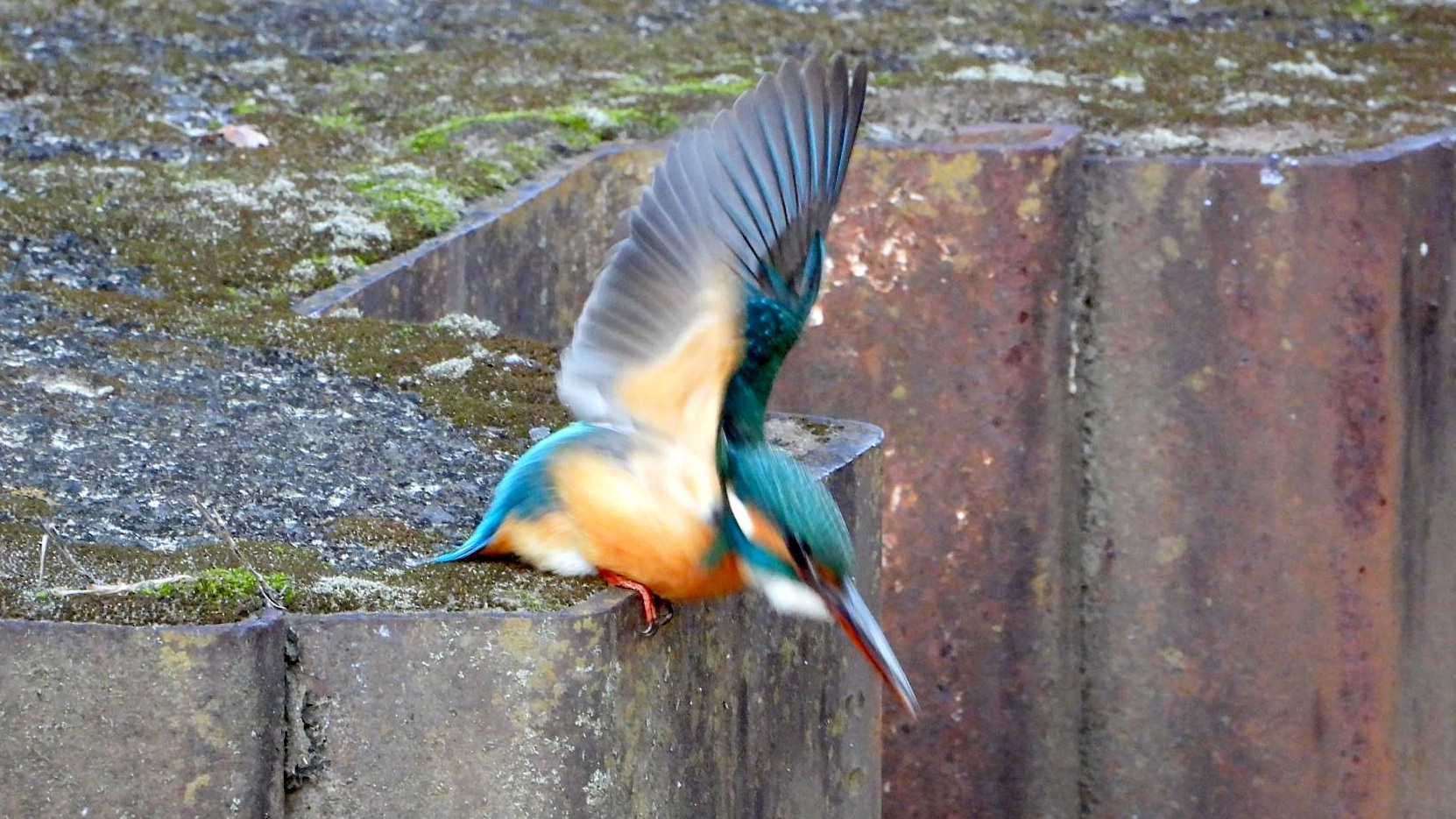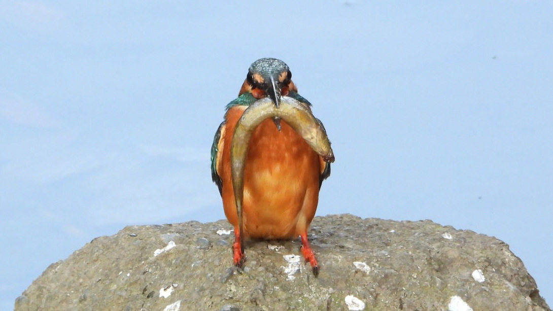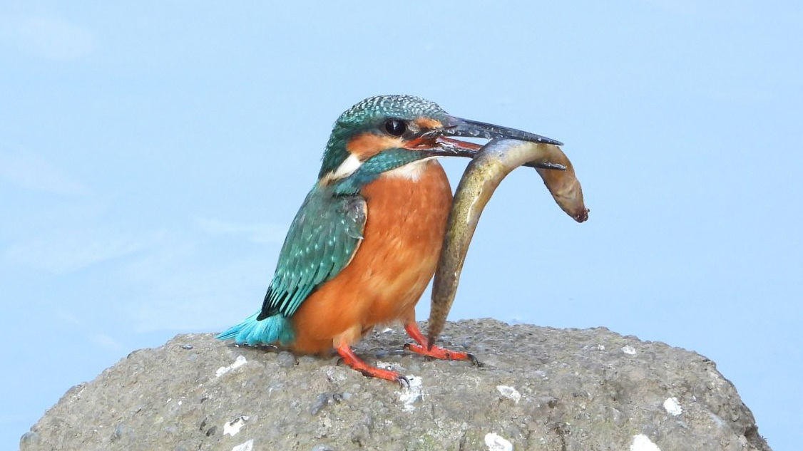 ⬇️ カワセミ きょうは3羽だった。下流の個体が、大きなドジョウを捕食した。
