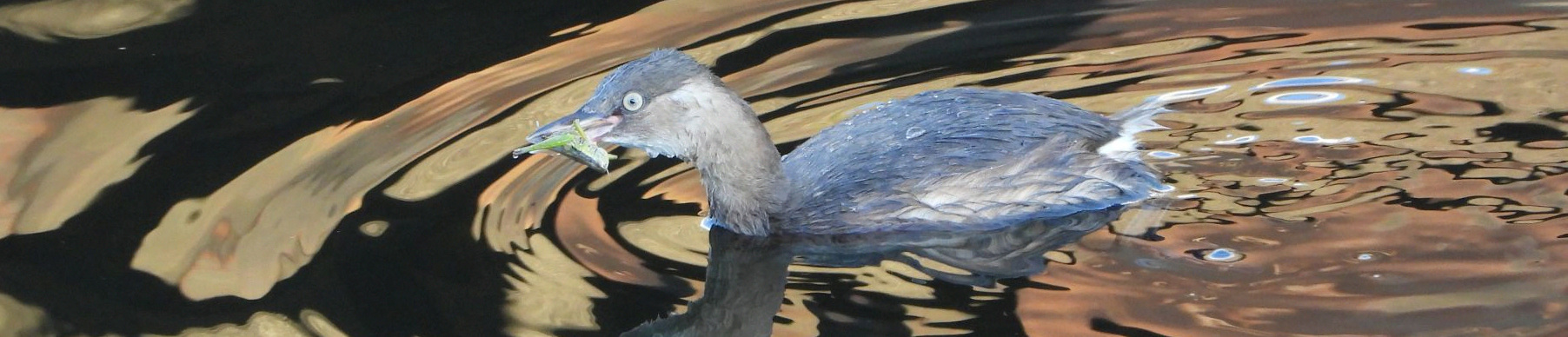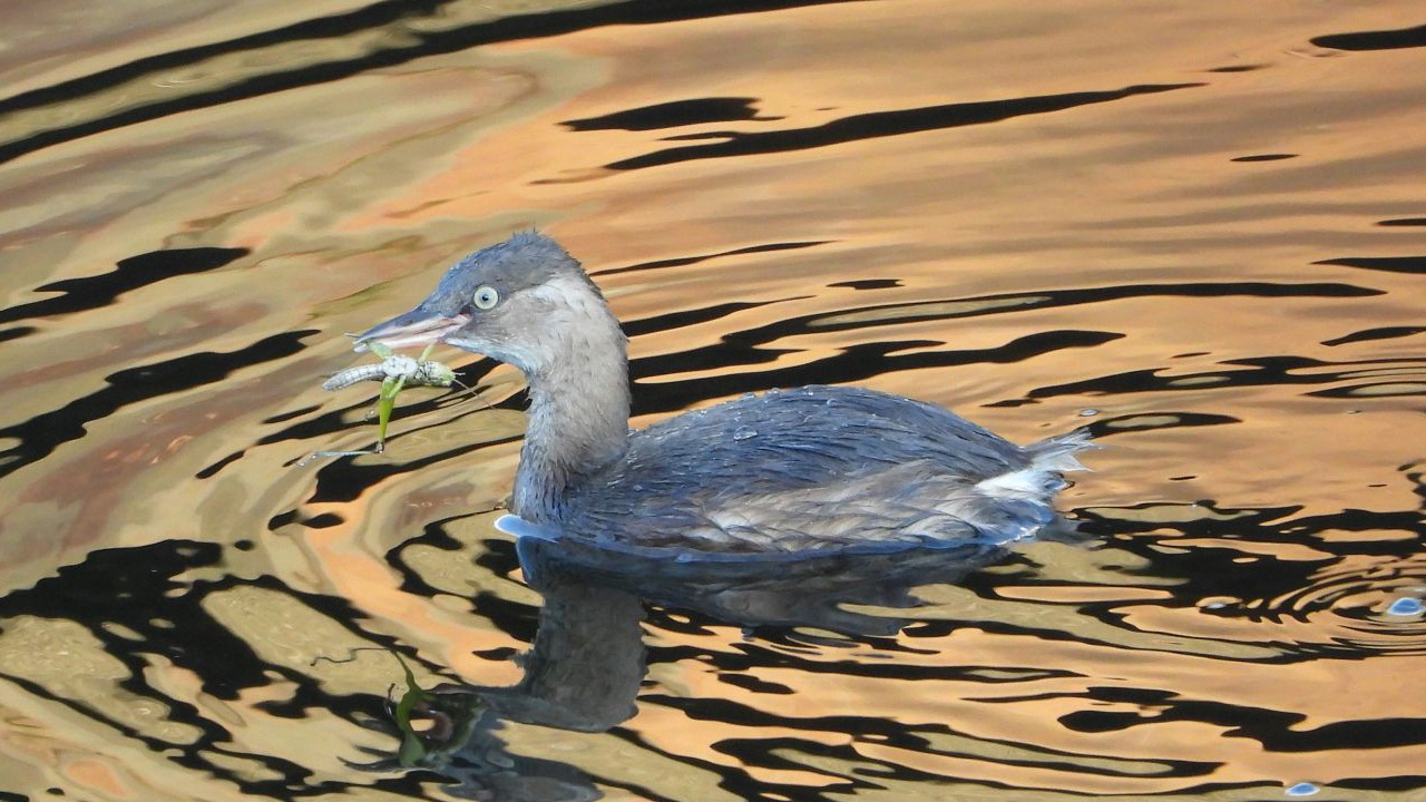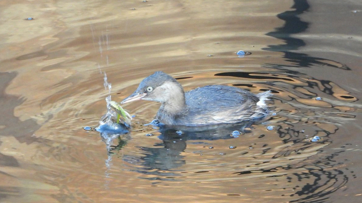 ⬇️ カイツブリ 水面に落ちたバッタを見つけた。脚や羽が邪魔でなかなか飲み込めない。