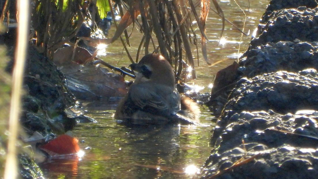 ⬇️ モズ 肉眼では確認できない場所で水浴び。カメラのズームがなければモズとは分からなかった。