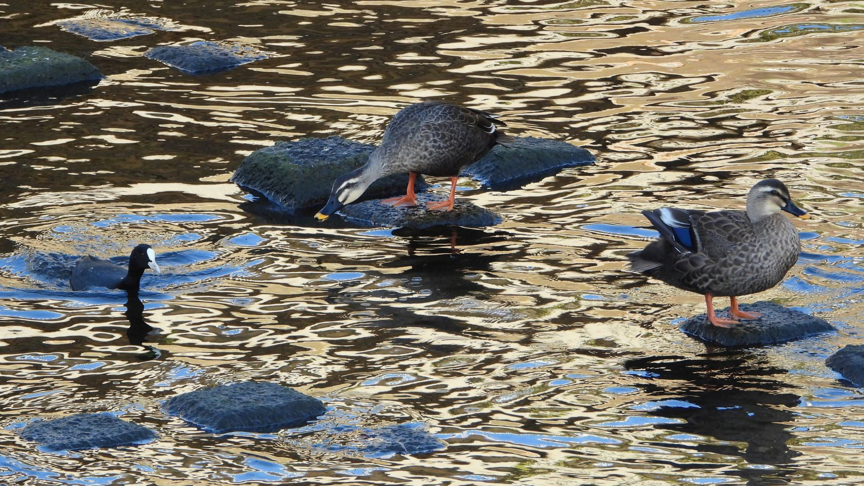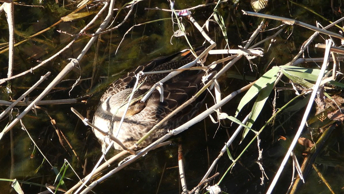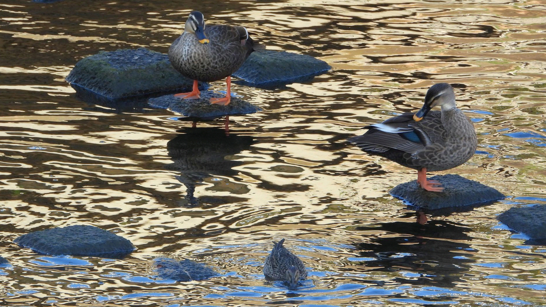 ⬇️ カルガモ いつもの場所で昼寝中。きょうは5羽だった。