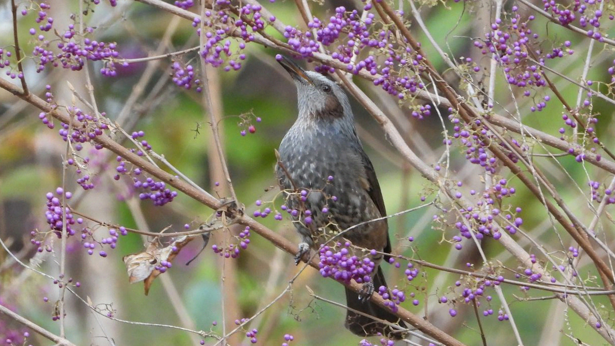 ⬇️ ヒヨドリ 鈴なりのムラサキシキブの実が、あっという間に食べ尽くされていく。