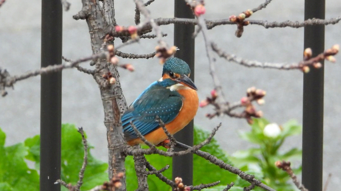 ⬇️ カワセミ きょうは3羽だった。1羽が早咲きの桜に止まった。ピンボケでも絵になるなあ。