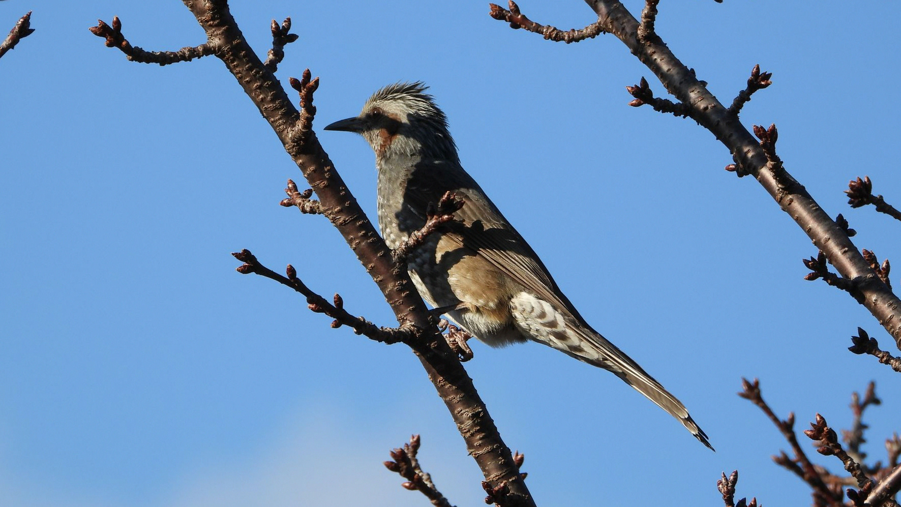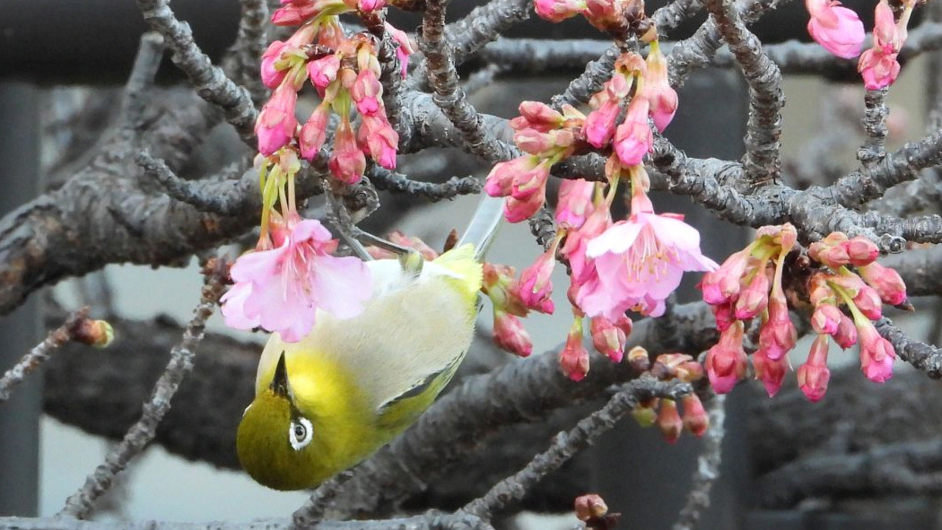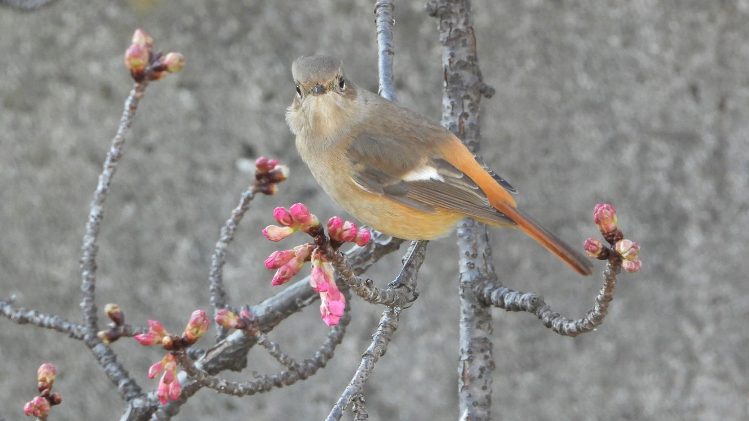⬇️ ジョウビタキ(メス) 早咲きの桜は、もう枝先まで咲き始めた。