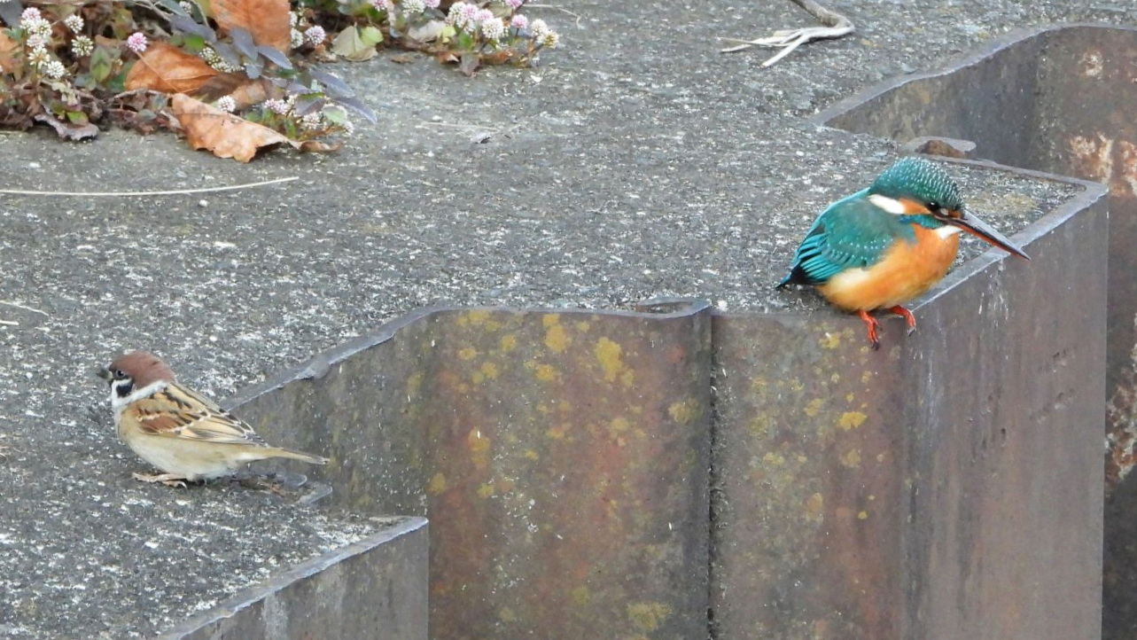 ↓ スズメは、カワセミに気が付かなかったのか、どんどん近づいて行った。