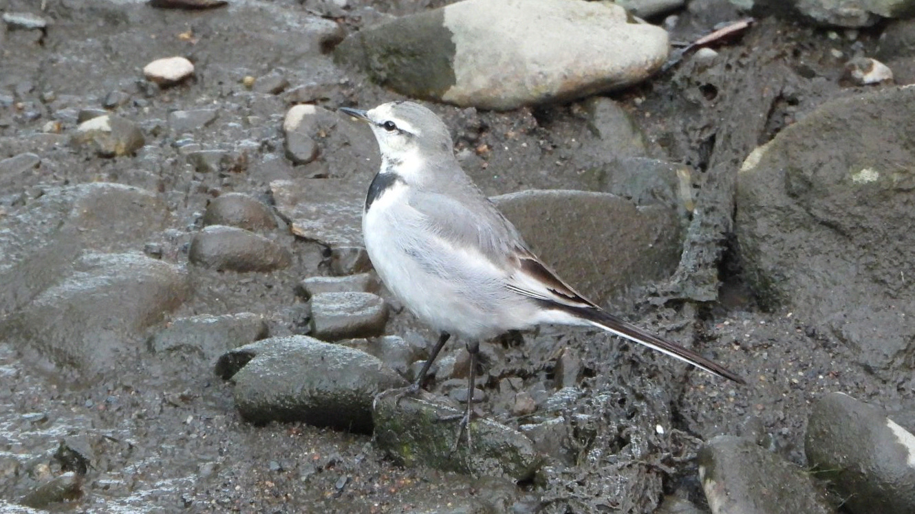 ↓ ハクセキレイとキセキレイも、カワセミと同じ水溜りで餌探し。小さなエビを捕まえた。