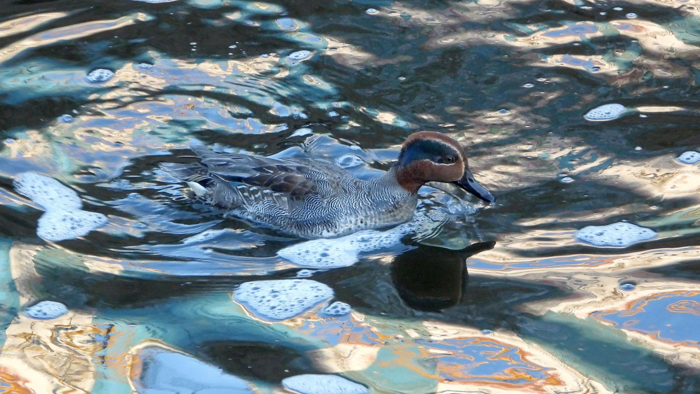 ⬇️ コガモ 夕暮れの水面はマーブル模様が美しい。