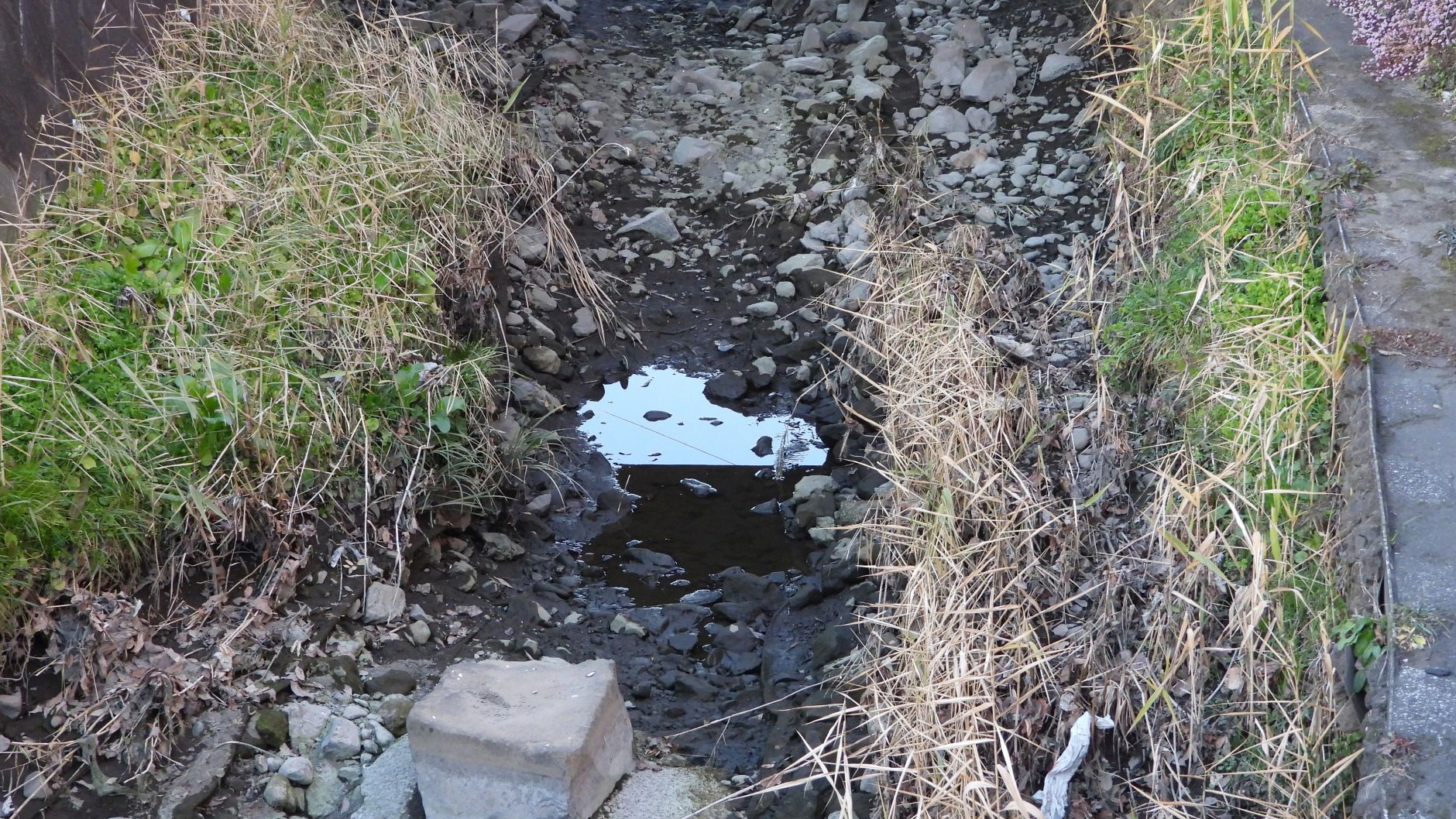 ↓ 50cm✕200cmほどの橋の下の水溜りでも餌を捕っていた。水深は20cmあるだろうか。