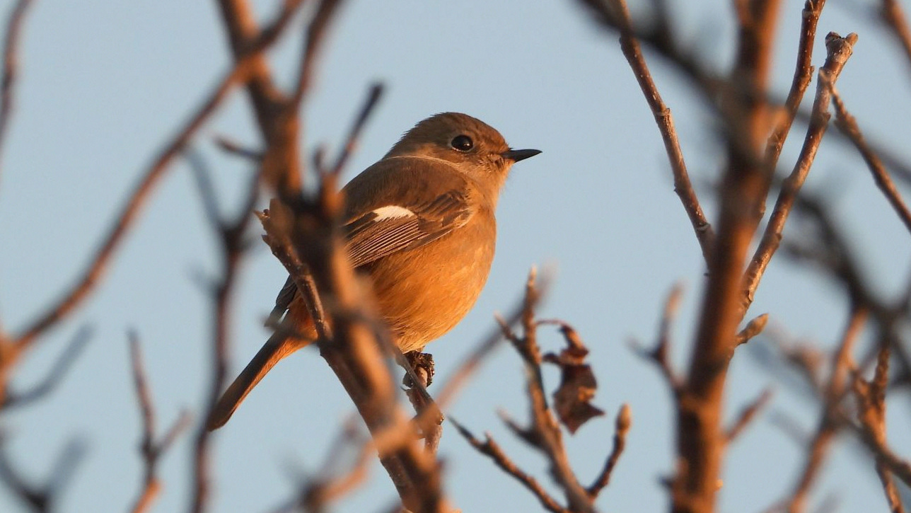 ⬇️ ジョウビタキ(メス) 夕日に赤く染まり、紋がなければ違う鳥と間違えそうだ。