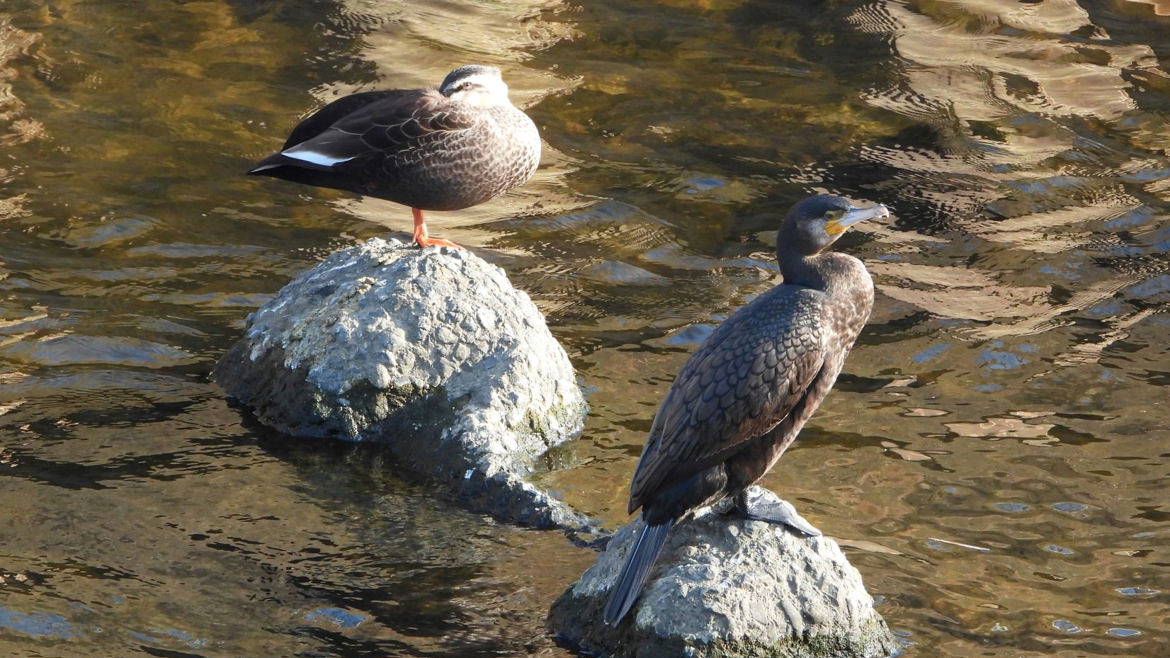 ⬇️ カワウ カルガモ このカワウは、羽の色からまだ若い鳥のようだ。