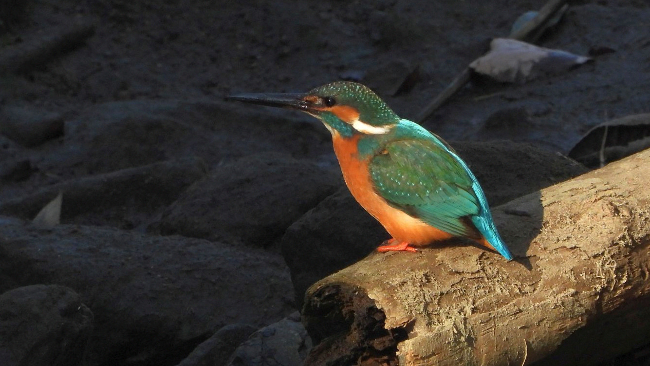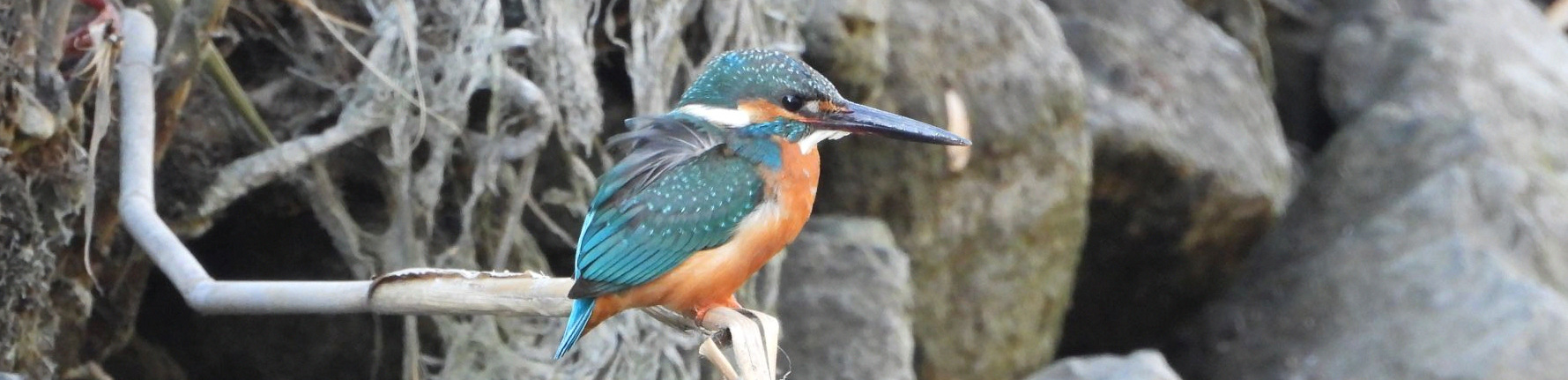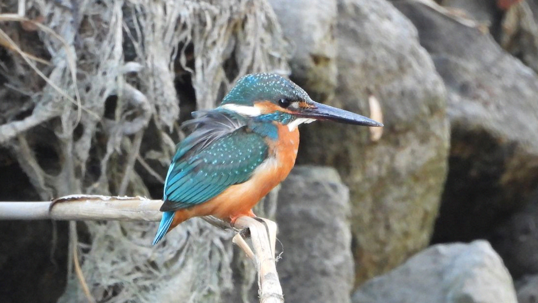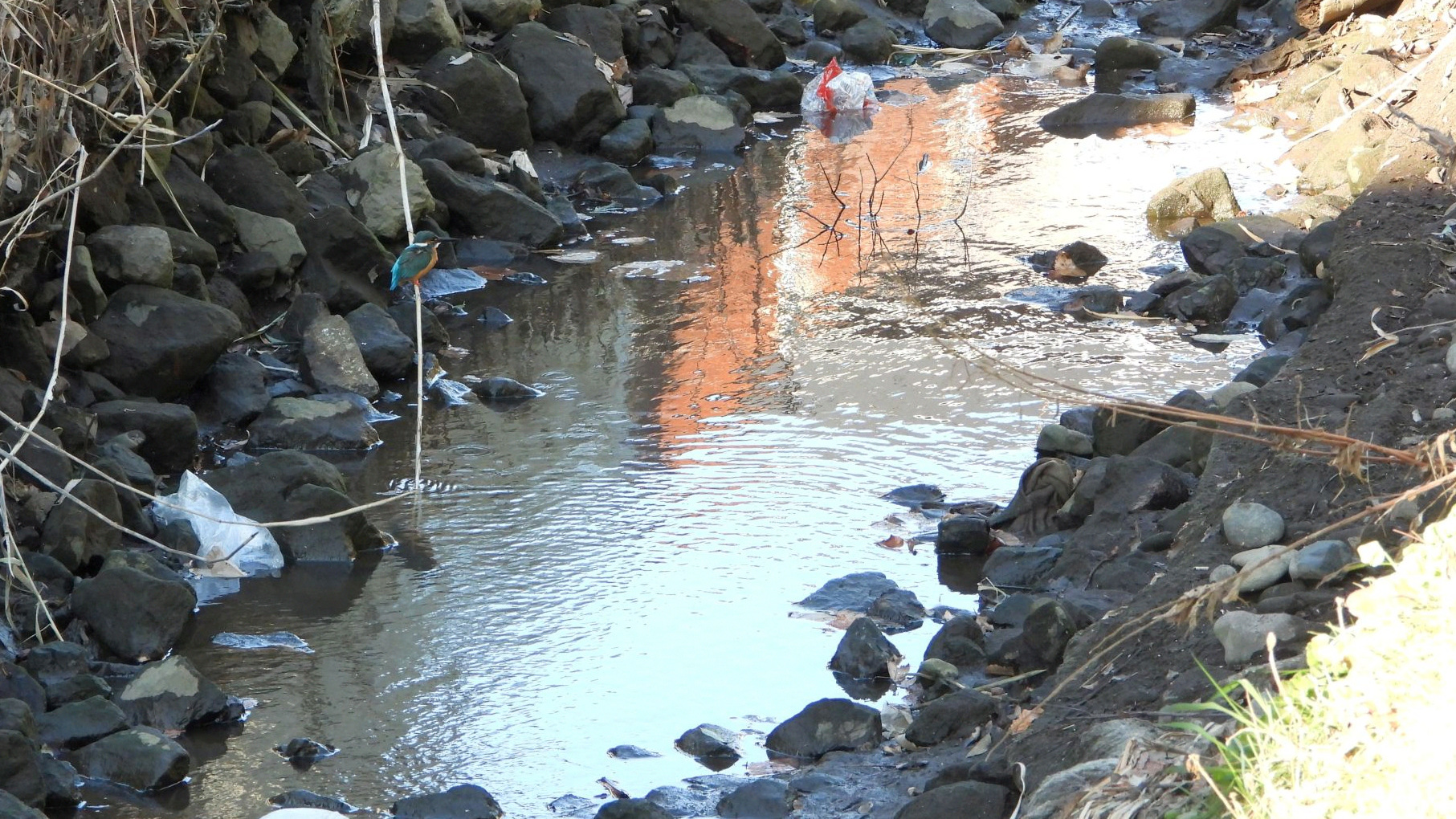 ⬇️ カワセミ   3m✕1m、深さ20cmほどの水溜りで餌を捕っていた。強風でゴミも多い。 ↓ 小さなエビのようなものを捕った。この水溜りももうすぐ無くなるだろう。