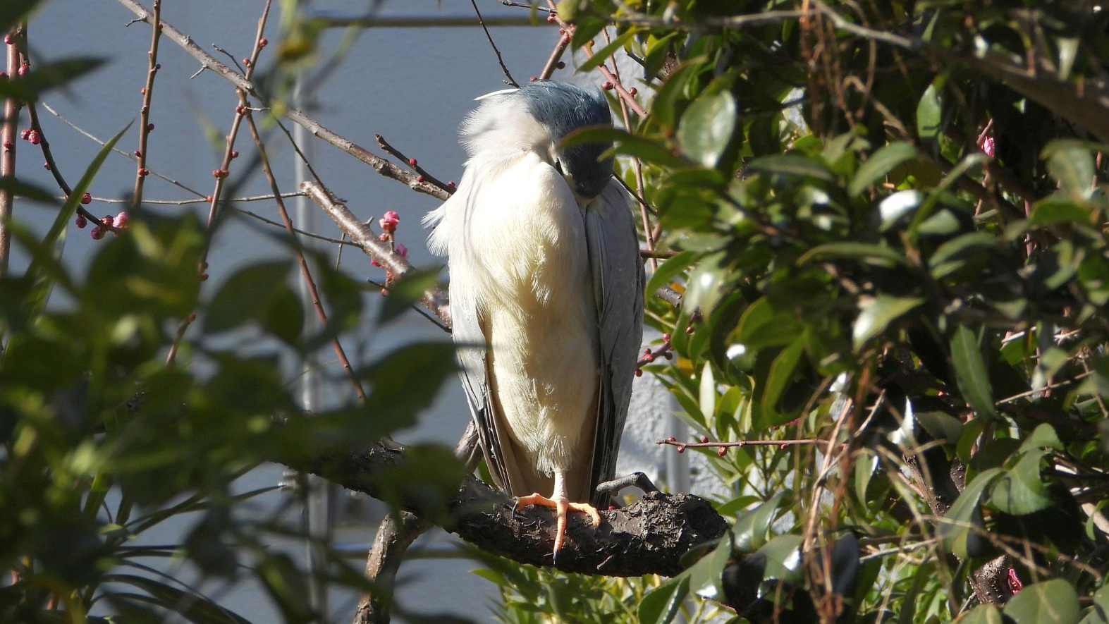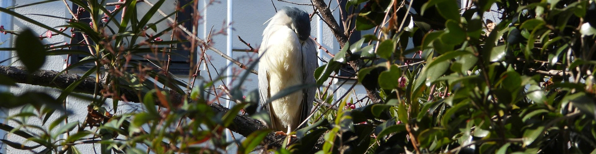 きょうはいつもより短い散歩。「ウォーク入口」の梅の木でゴイサギが昼寝中だった。
