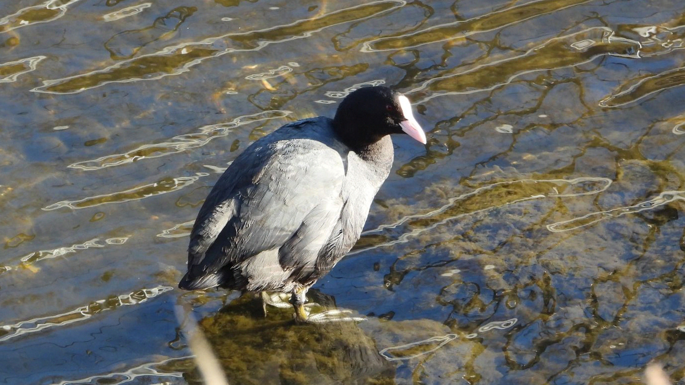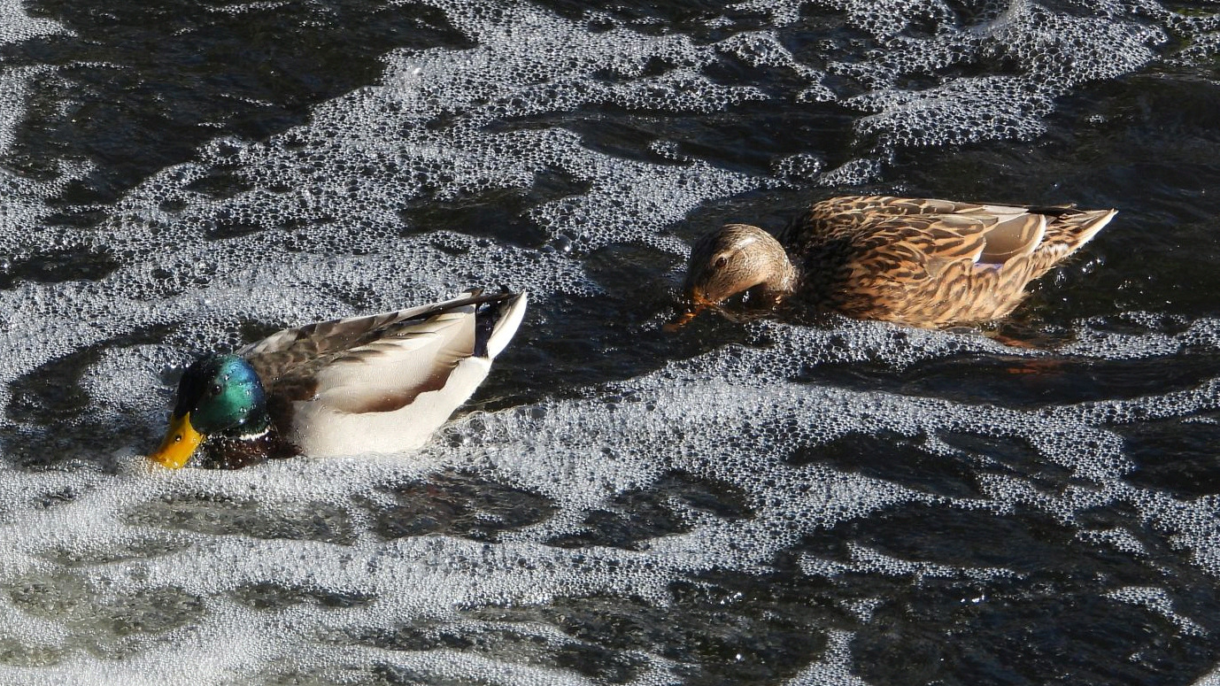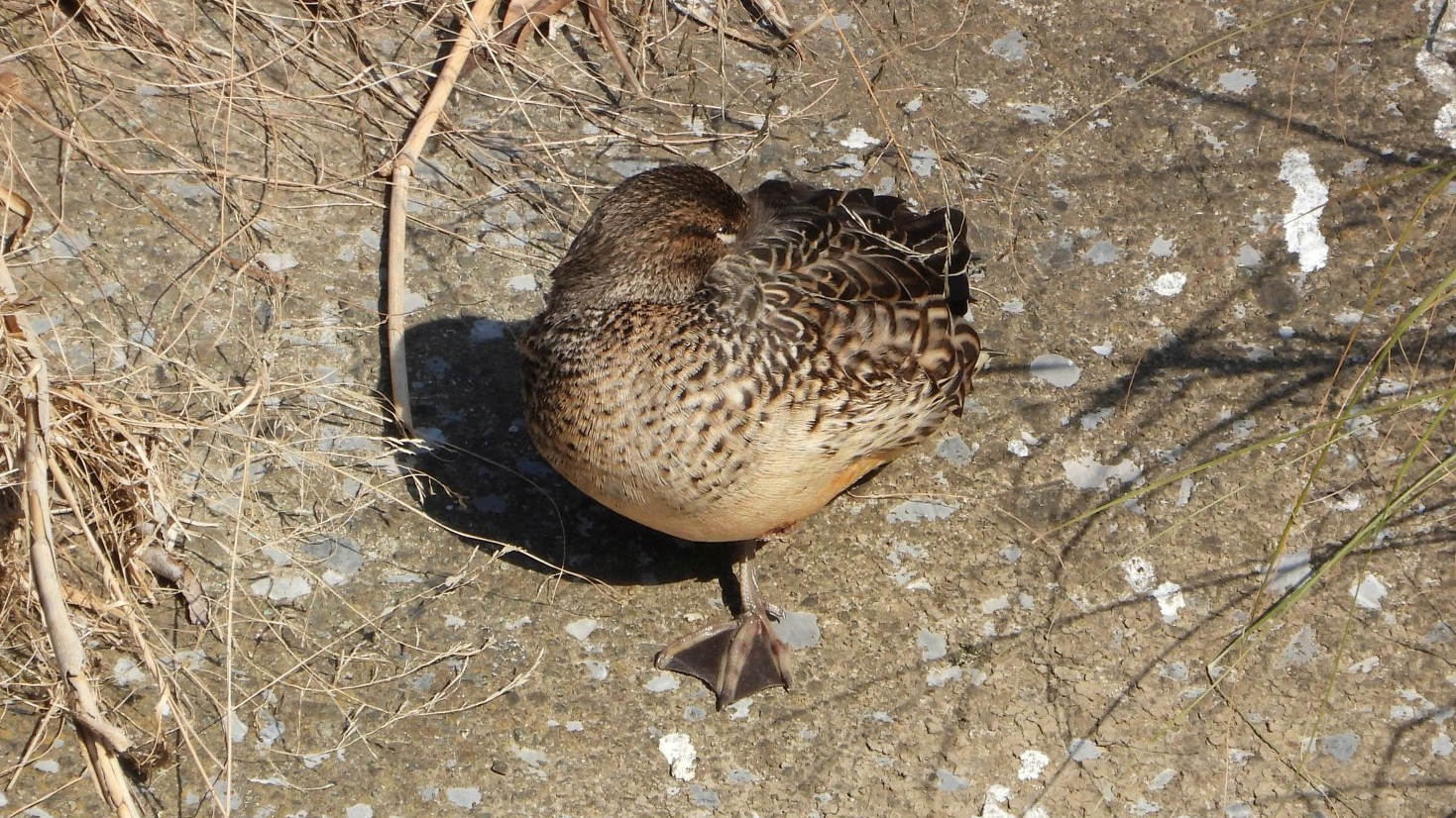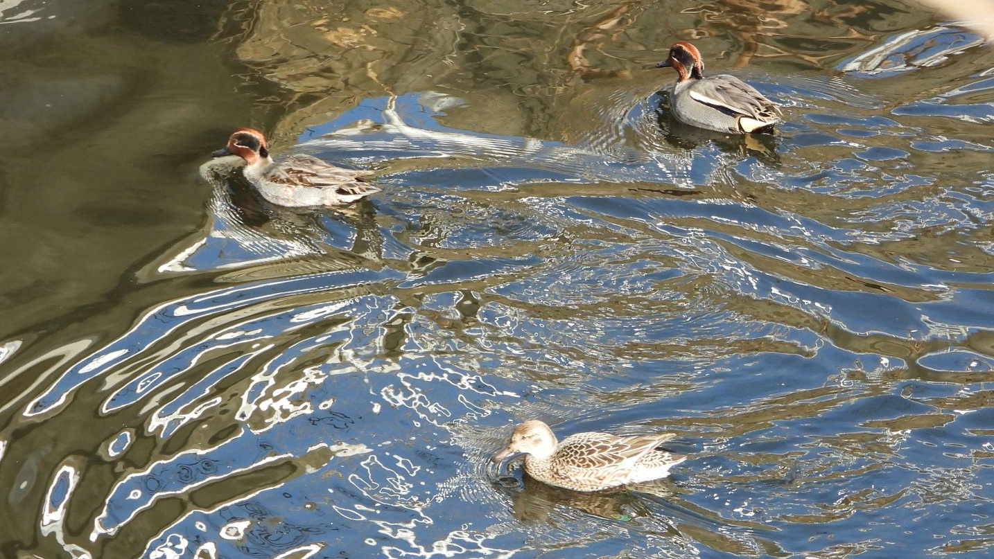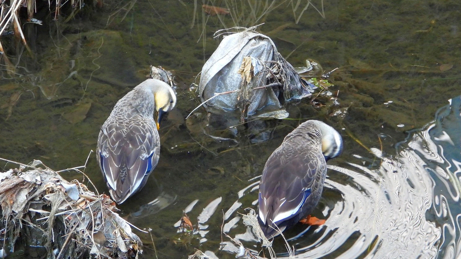 ⬇️ カルガモ きょうは4羽だった。相沢川は相変わらずゴミが多い。