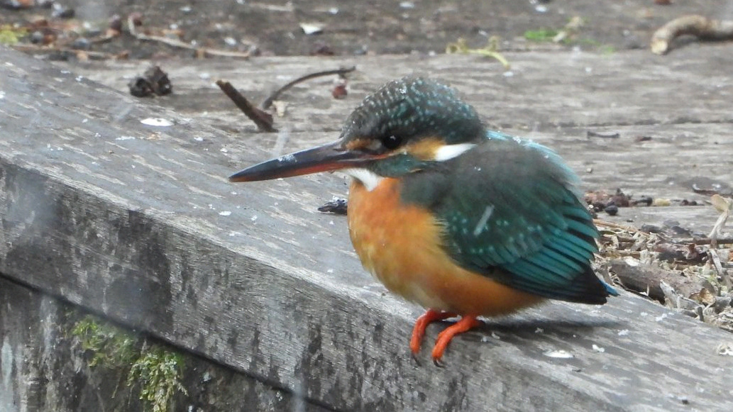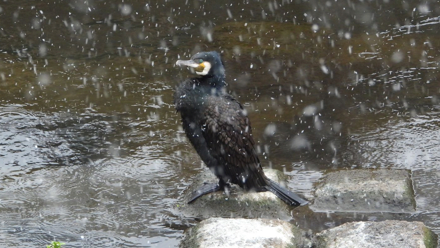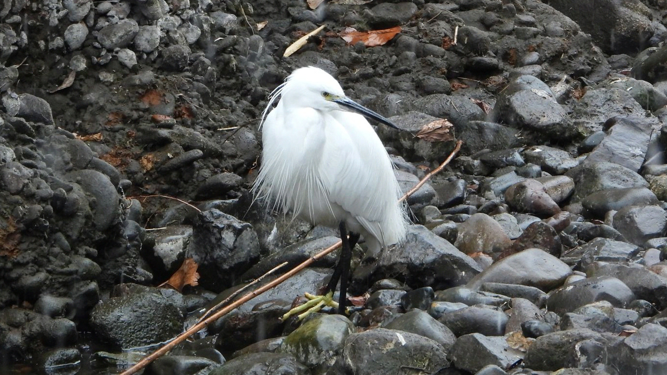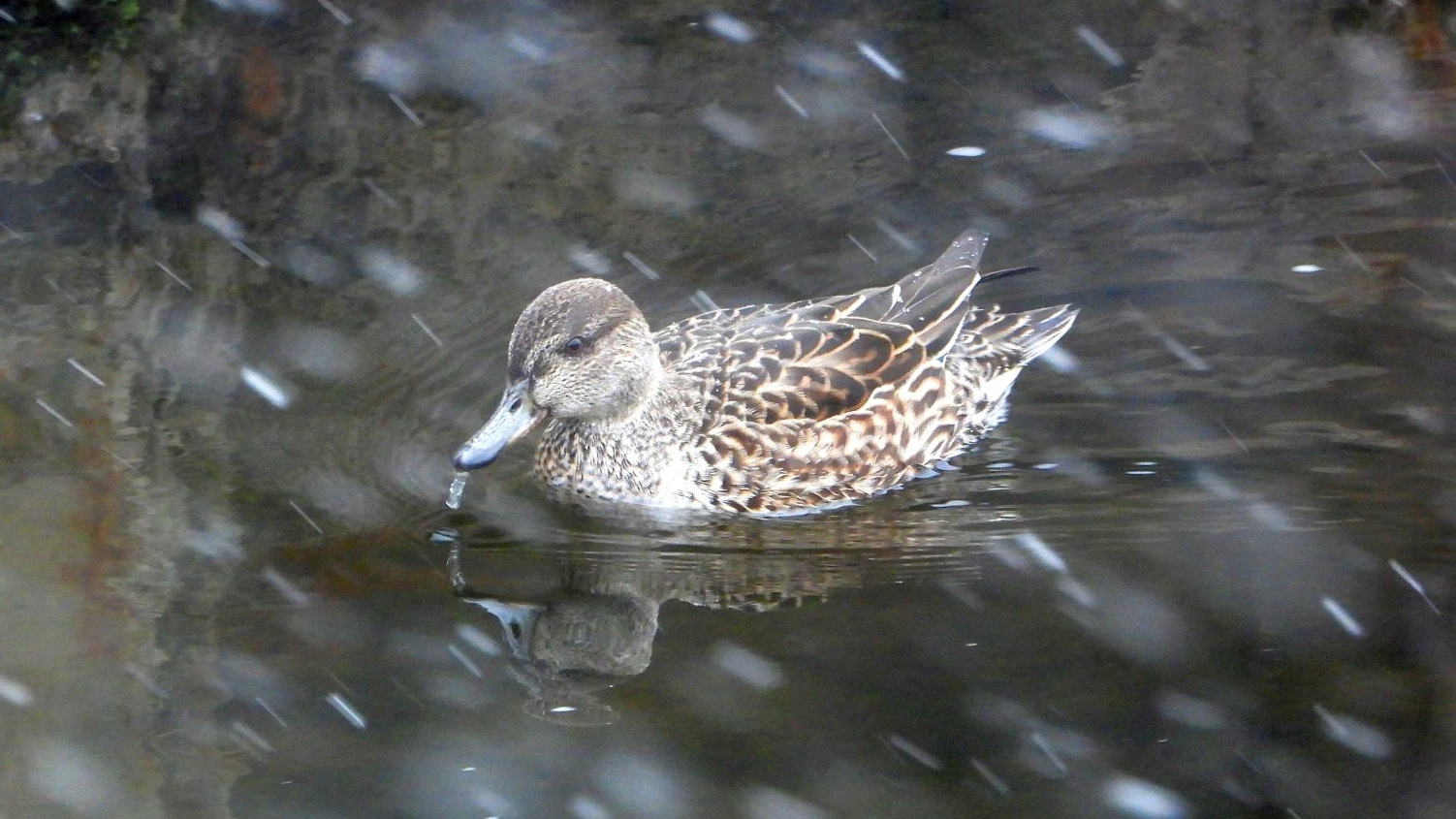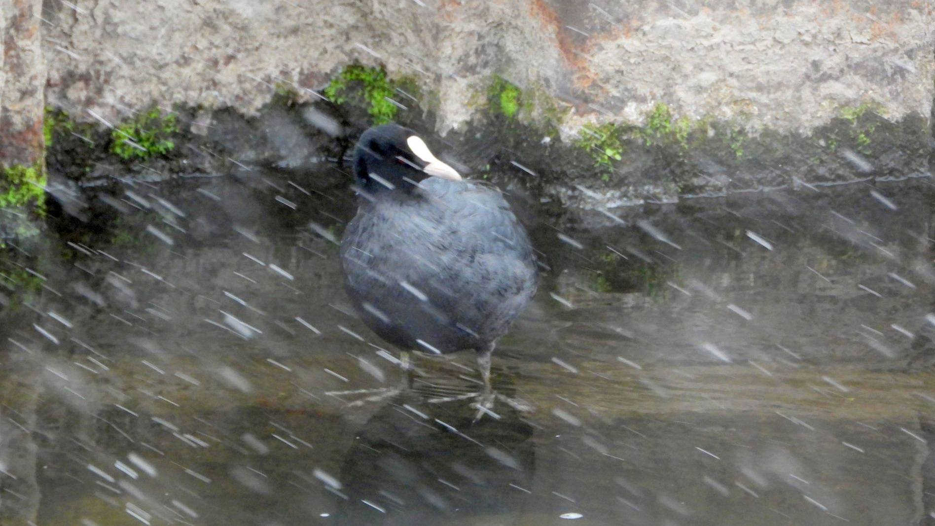 雪が降リ始めたがいつものように歩いてみた。森の鳥たちは出て来なかったが、水鳥は元気に動き回っていた。試しに傘を差して写してみた。