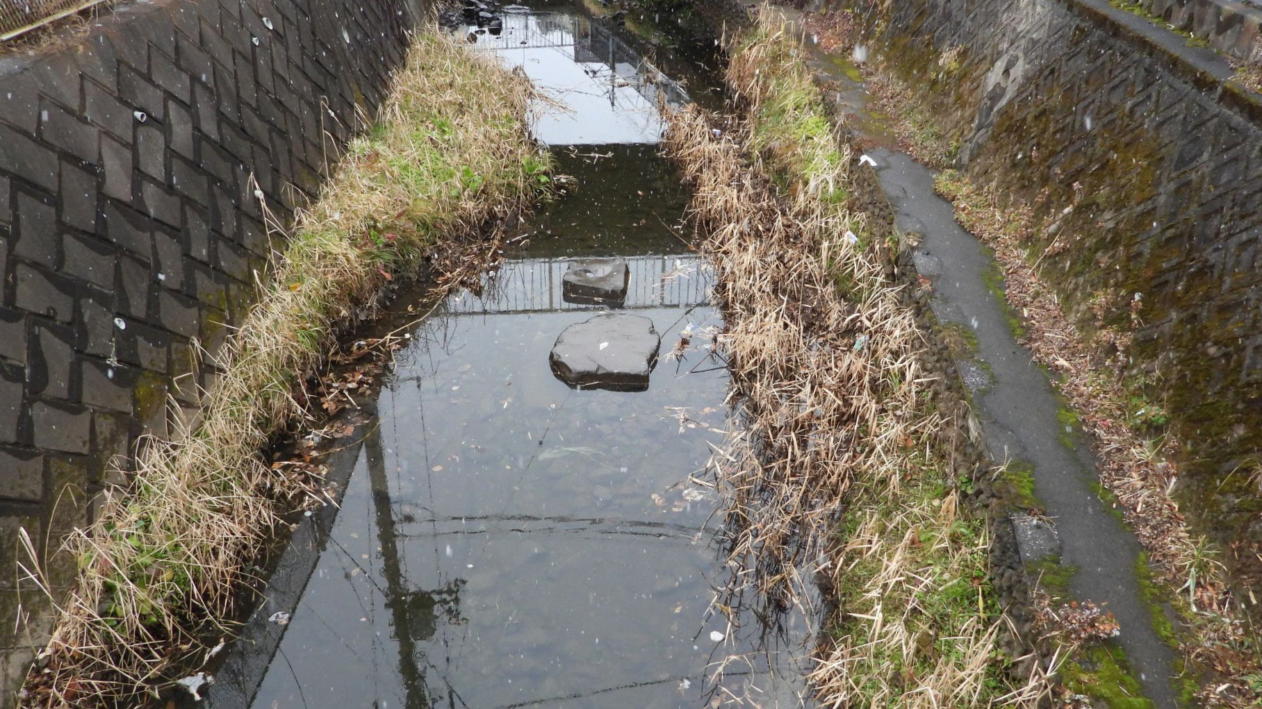 ⬇️   流れの先端 雪が降り始め水が流れ始めた。泡立って見えるのが流れの先端。  ↓ 同じ場所の50分後の様子。雪はそんなに降ったようには思わないが、水量はこんなに増えた。