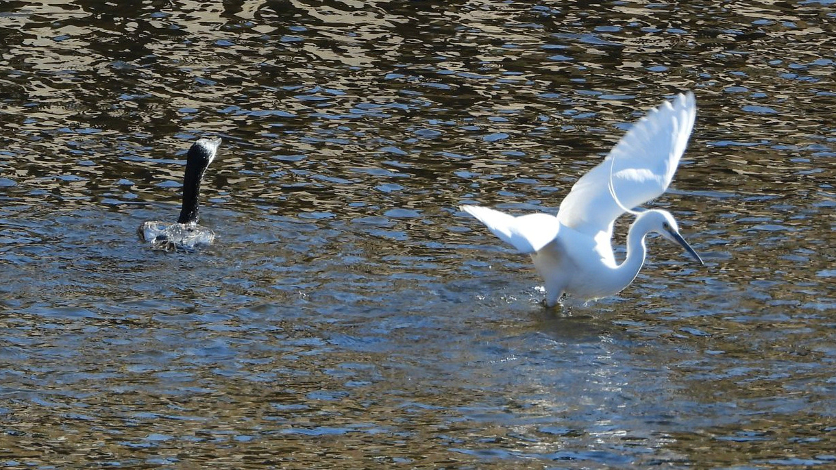 ⬇️ コサギ カワウ カワウが泳ぎ回ることで、コサギの餌取りを助けているようだ。