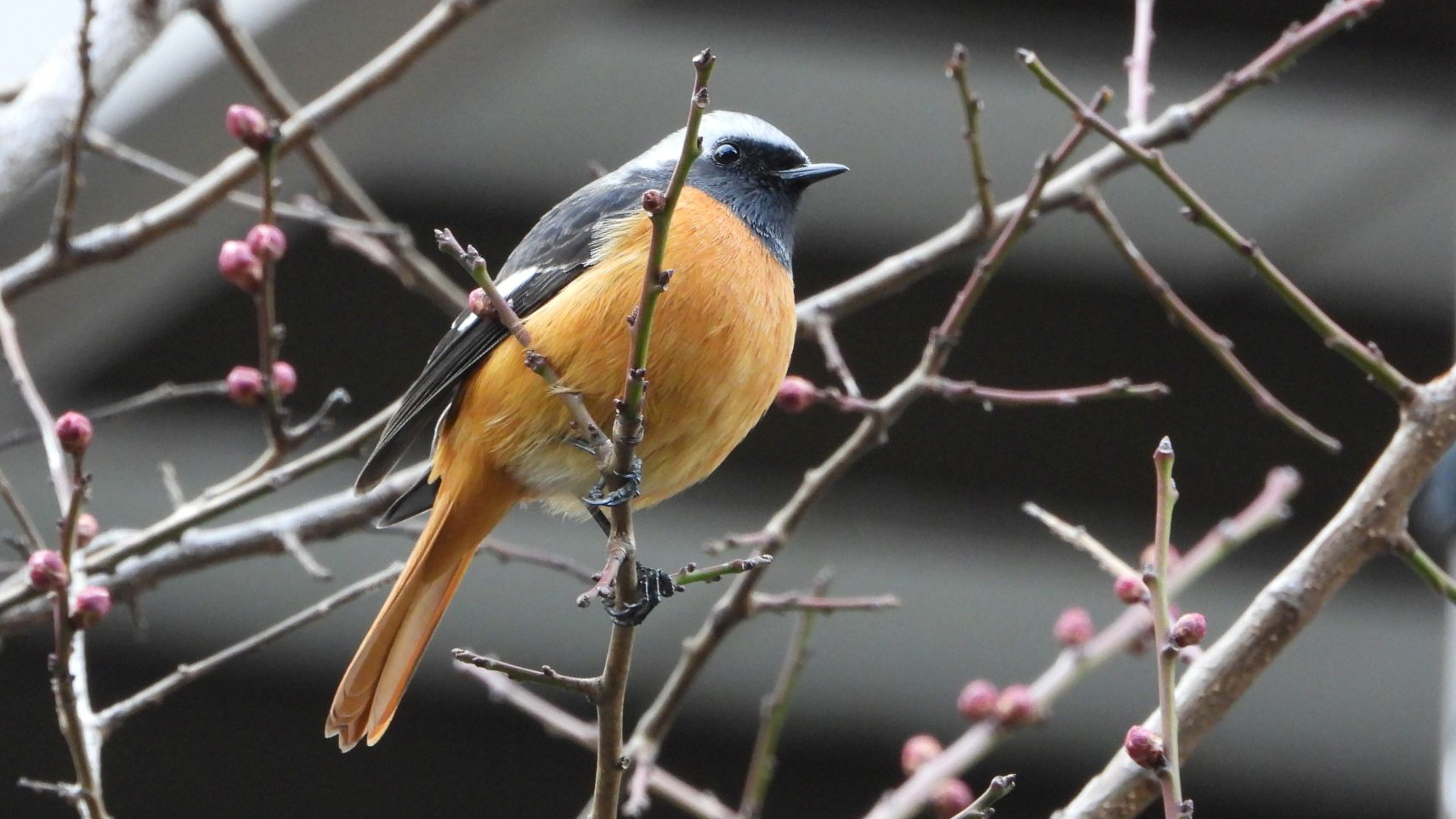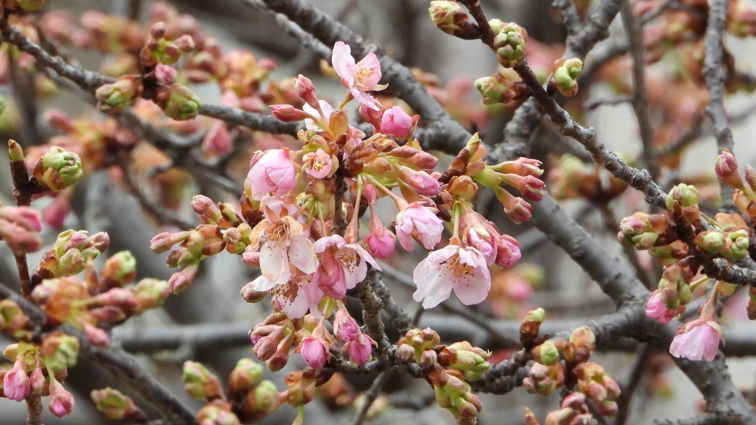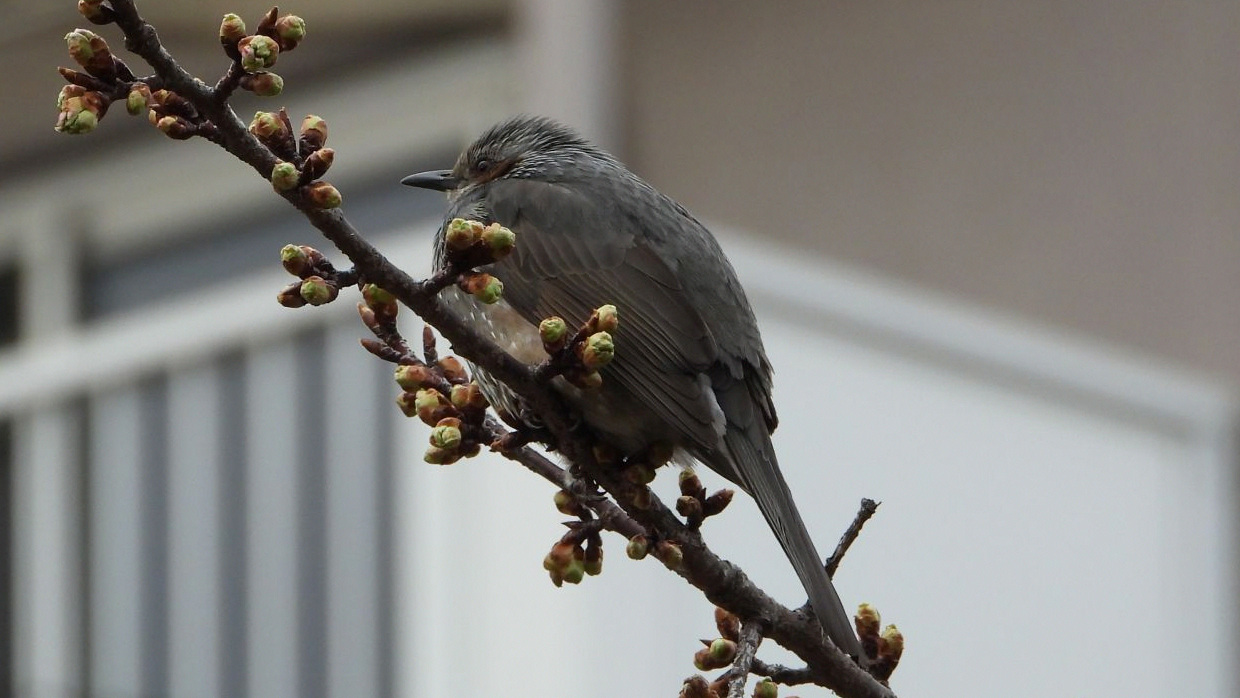 ⬇️ ヒヨドリ カワヅザクラに止まっている。枝先の蕾はまだ固い。