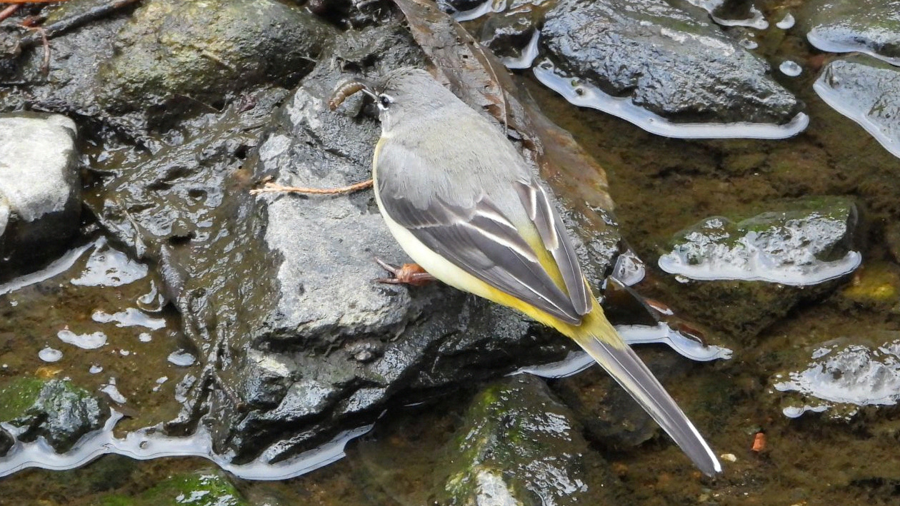⬇️ キセキレイ 甲虫の幼虫?を捕食。
