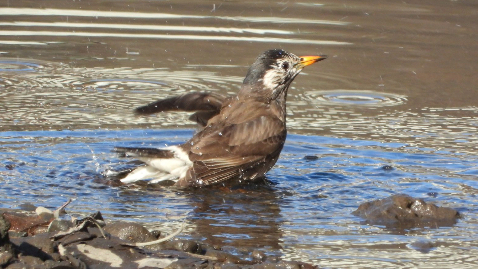 ⬇️ ムクドリ 川の中の水溜りで水浴び中。