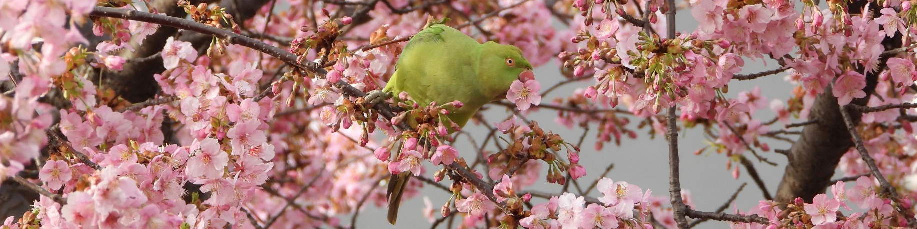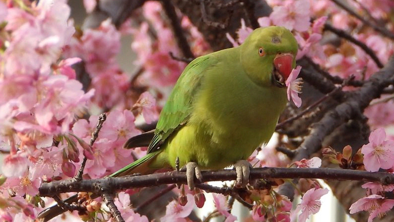 ここ数日は暑いほどの陽気。宮久保橋まで歩いたが、カワヅザクラはすでに散り始めていた。そのカワヅザクラにワカケホンセイインコが1羽来ていた。花をもぎ取って蜜を吸ってはポイ捨て。ただでさえ花の生命は短いというのに。