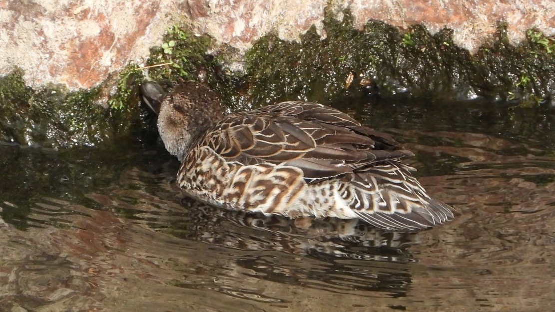 ⬇️ コガモ 壁面の苔?藻?を、こそげ取るようにして食べている。