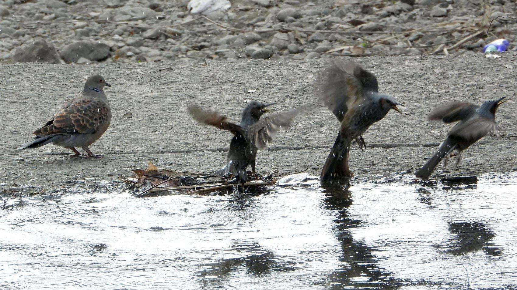 ⬇️ キジバト ヒヨドリ 可動堰近くの水溜りは、鳥たちの貴重な水浴び場になっている。