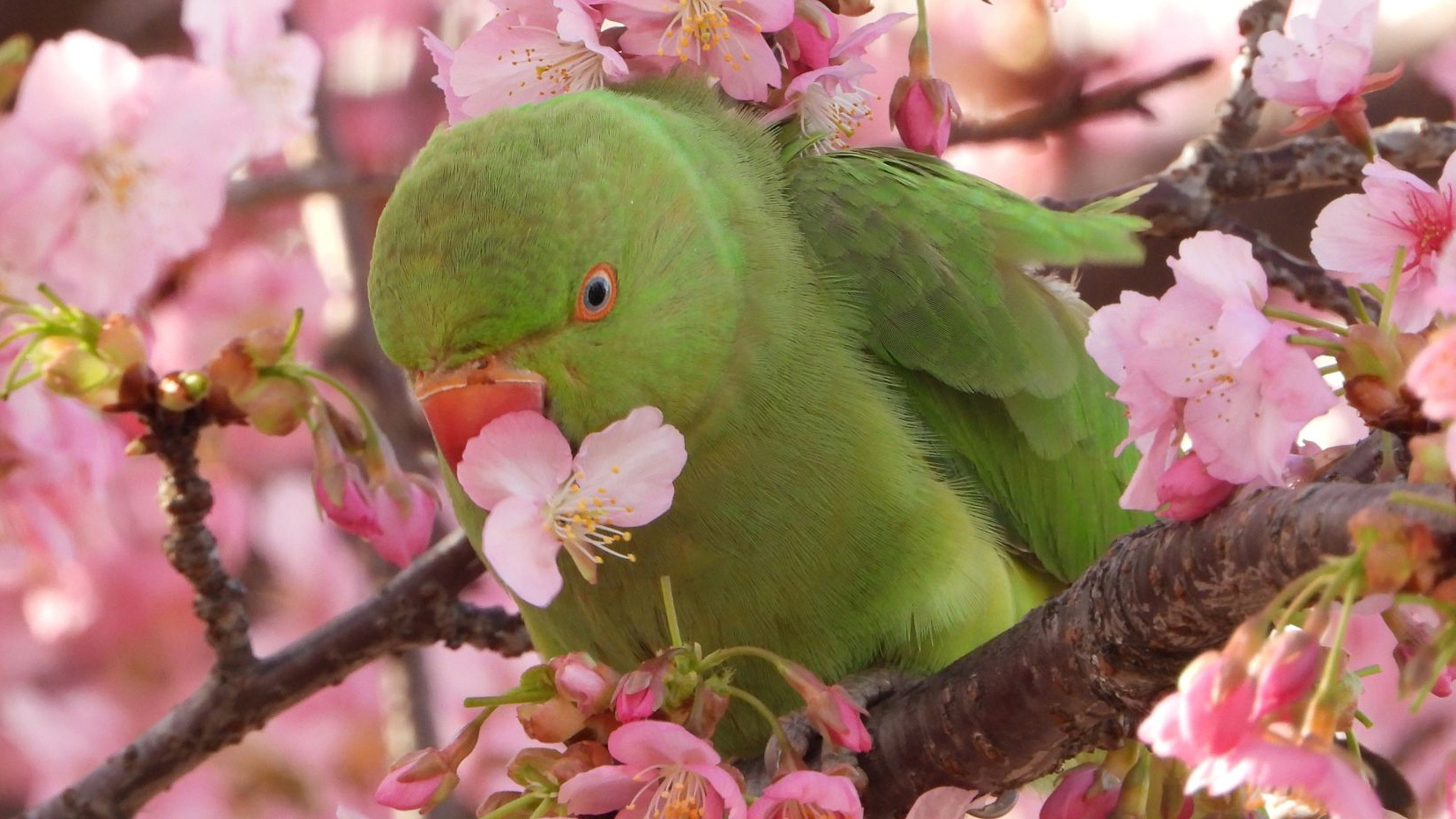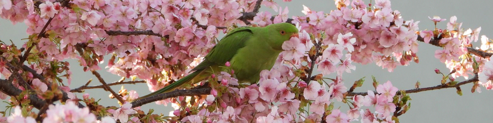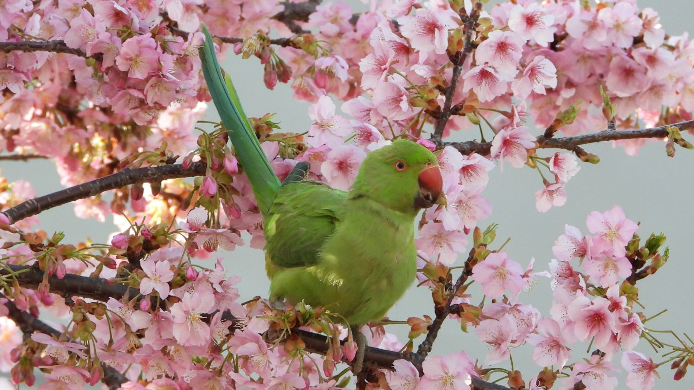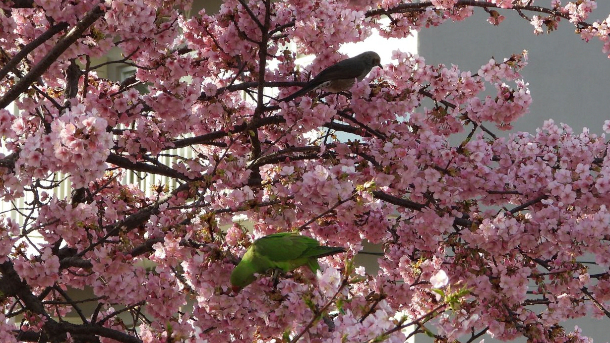 上着なしで歩いても汗ばむ陽気だった。カワヅザクラにワカケホンセイインコが4羽来ていた。近所の人たちは、見慣れているのか気がついていないのか、インコに注目する人はほとんどいなかった。