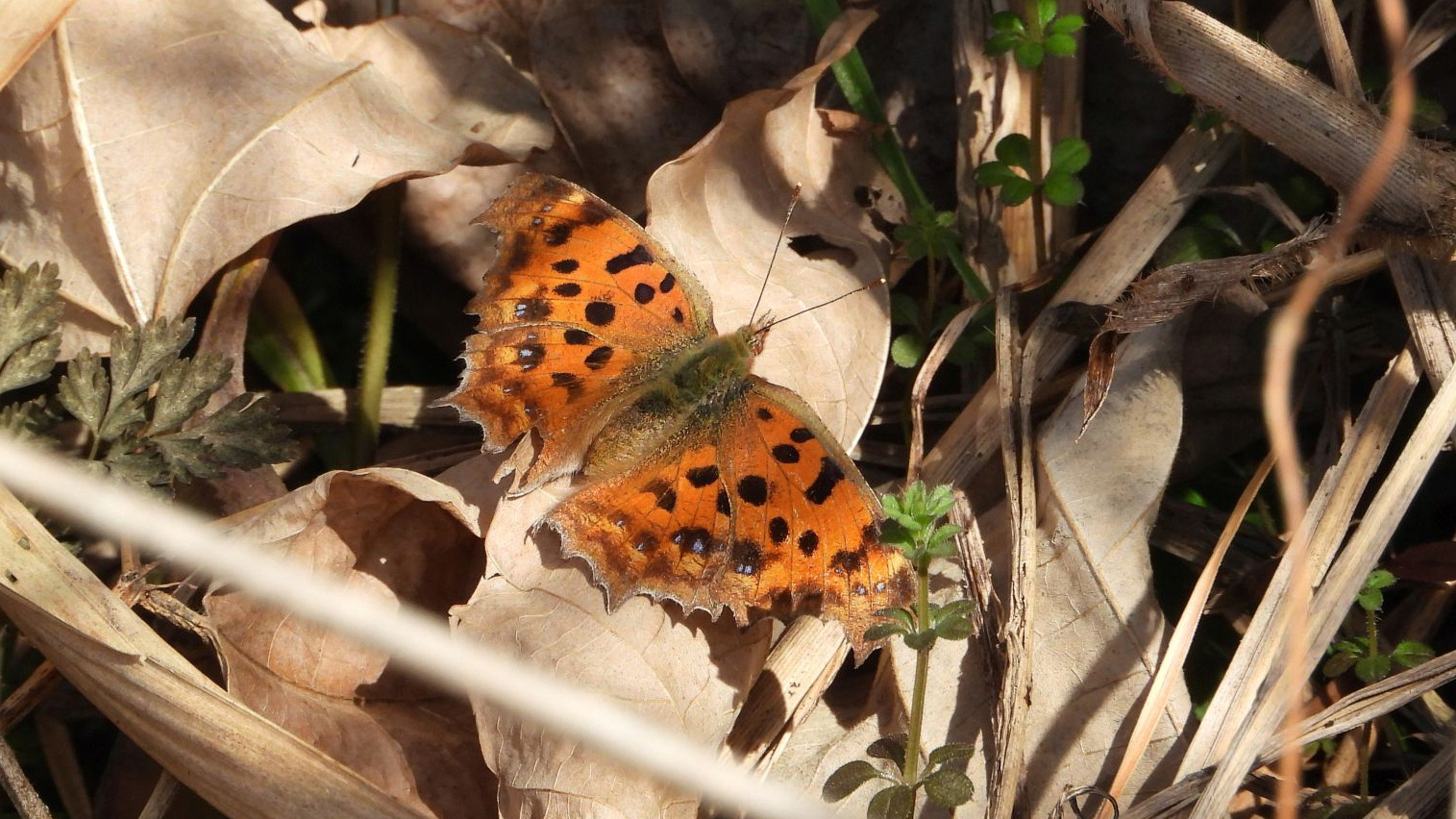 ⬇️ キタテハ 成虫で冬を越した個体だろうか。日光浴中。