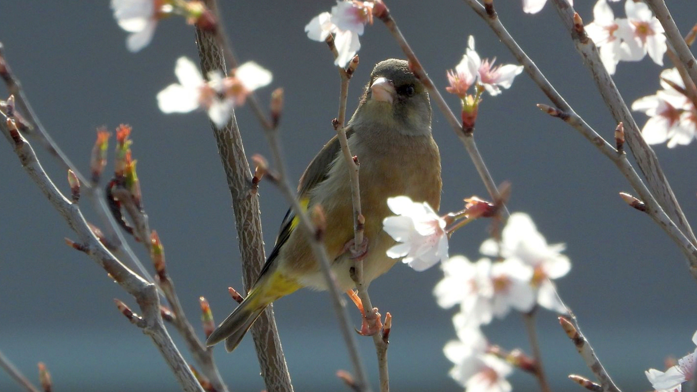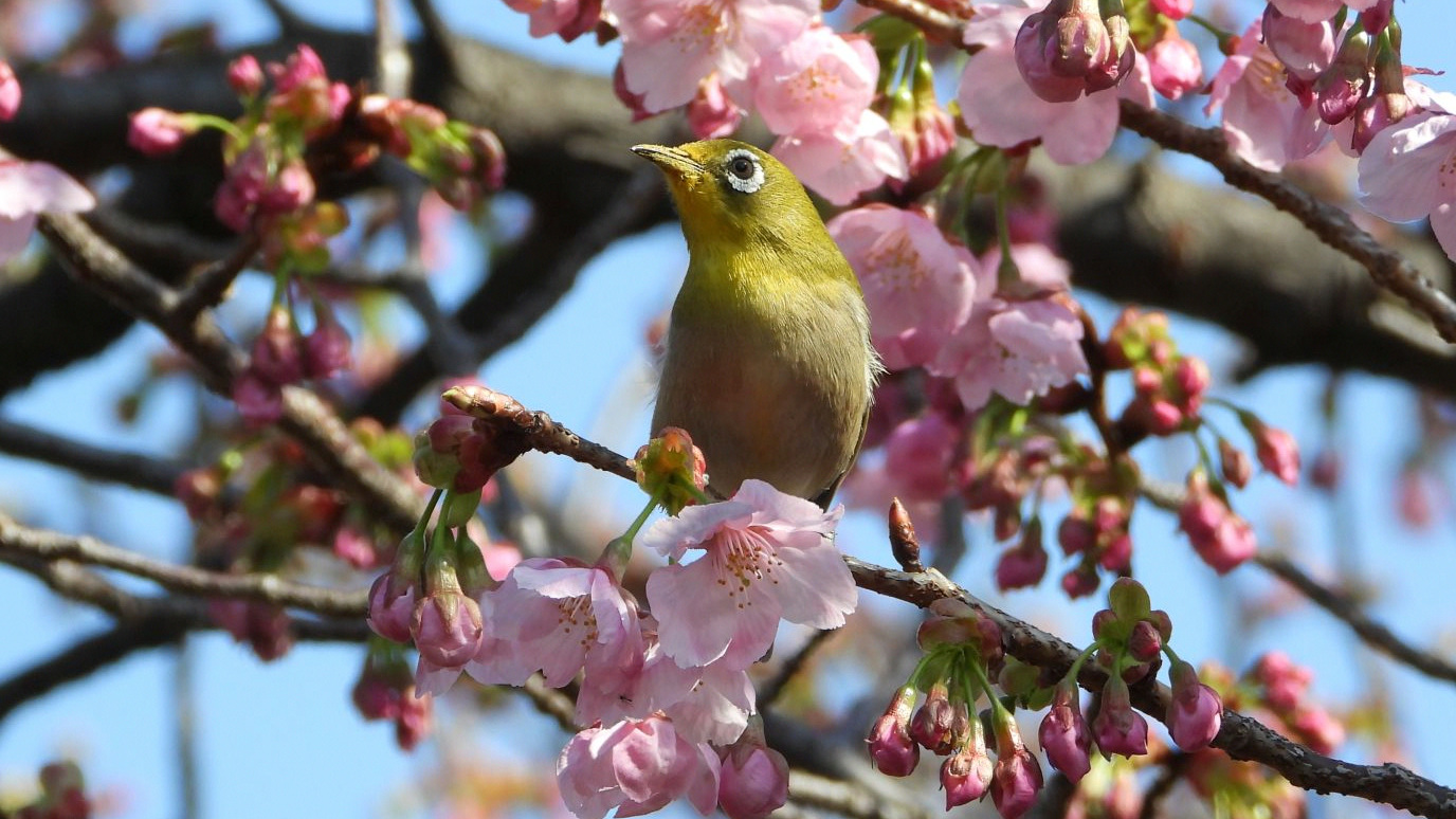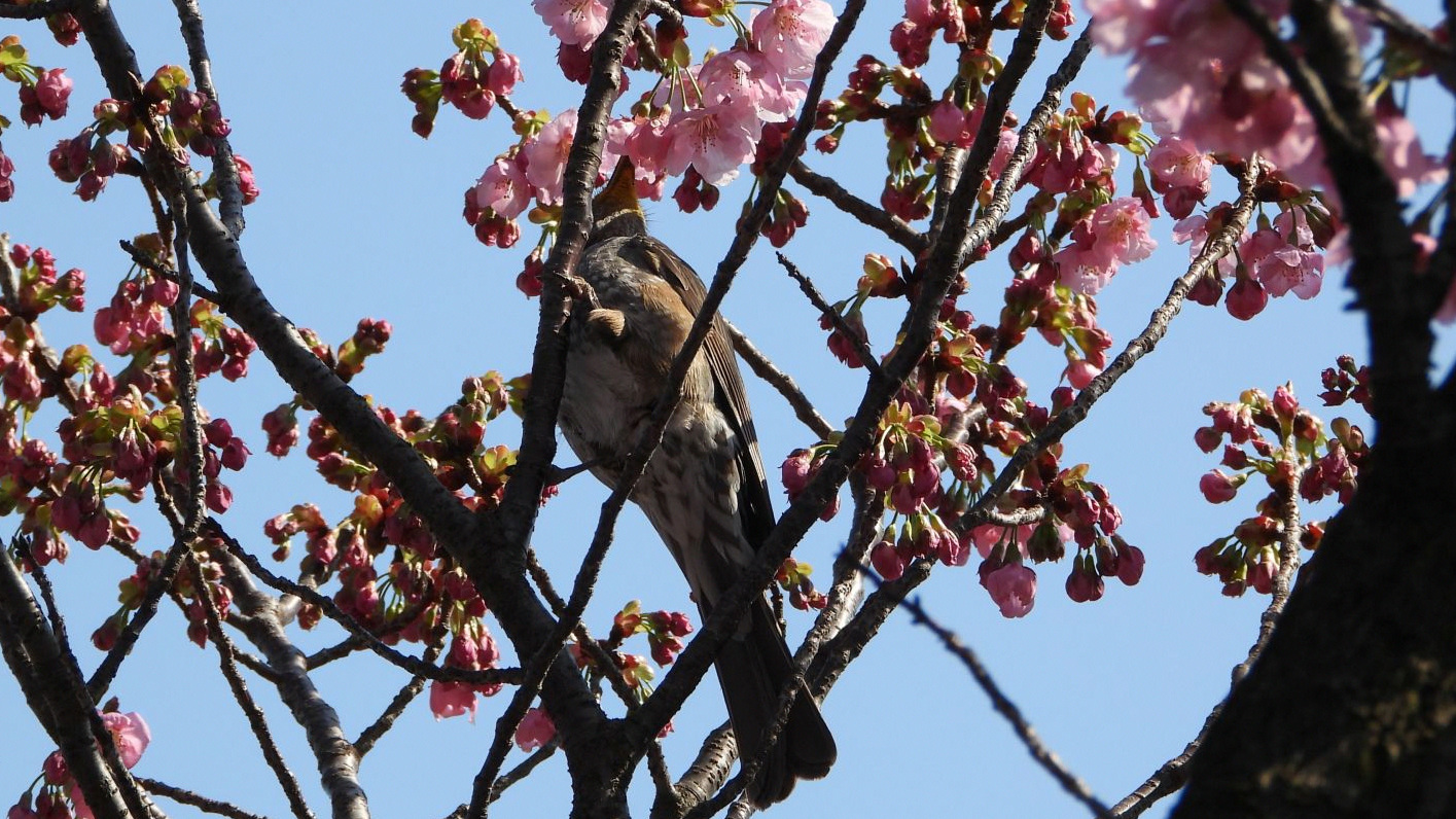 ⬇️ ヒヨドリ 横浜緋桜は陽光桜より色が濃く、下向きに咲くのが特徴らしいのだが…。
