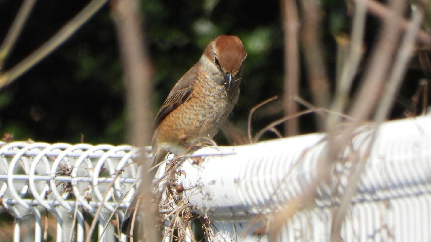 ⬇️ モズ 枝のようなものを咥えて飛んで行ったが、巣作り中なのだろうか。