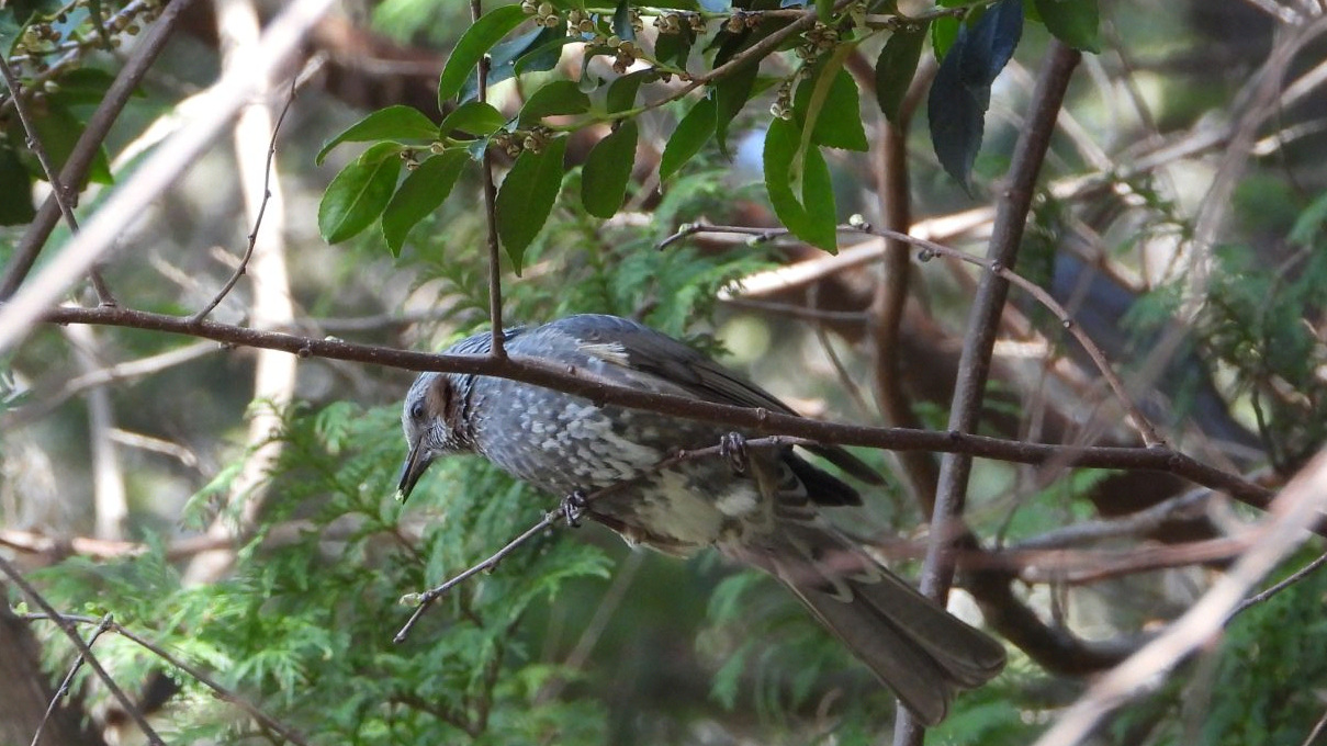 ⬇️ ヒヨドリ 食べているのは頭上の「ヒサカキ」の花だろう。