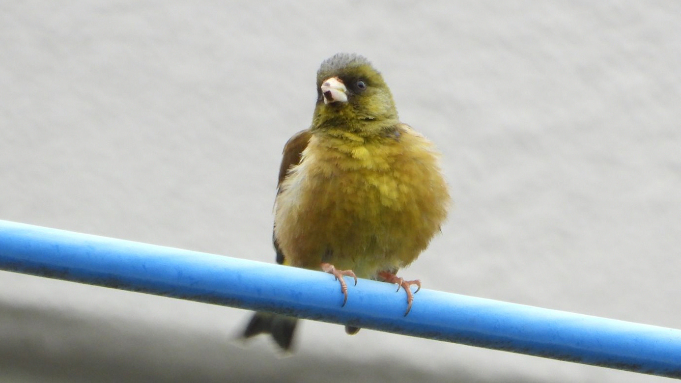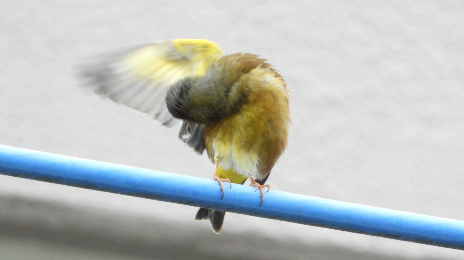 ⬇️ カワラヒワ 水浴び後の羽繕い。嘴の色が黒く変化しつつある。